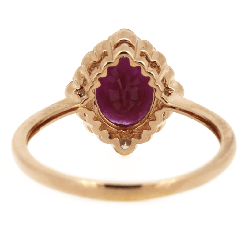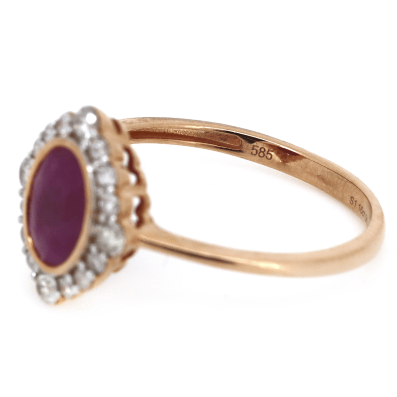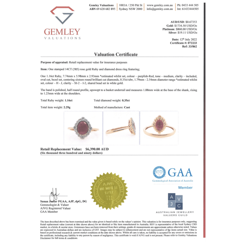 14K ROSE GOLD, RUBY AND DIAMOND, DRESS RING. THE CENTRE FEATURES, ONE OVAL CUT, PURPLISH-RED COLOUR, RUBY (1.16CT, CLARITY-INCLUDED), BEZEL SET. SURROUNDING THE CENTRE IN A HALO ARE, 16 ROUND BRILLIANT CUT, DIAMONDS (0.35CT TDW, H-J COLOUR, SI2-I2 CLARITY), CLAW SET. RING SIZE P. Valuations Provided by an Independent Third-Party Professional Not Directly Associated With Lloyds Auctions at AUD $6390This valuation has been conducted by an independent third-party professional. The valuation amount is an assessment by the issuing valuer and does not reflect the auction value of the item. Any inquiries regarding the valuation should be directed to the issuing valuer (refer to contact details on the certificate), as Lloyds Auctions has no affiliation or influence over the valuation, the valuer, or the stated amount. Condition: Good - Refer Images 0645871+1458