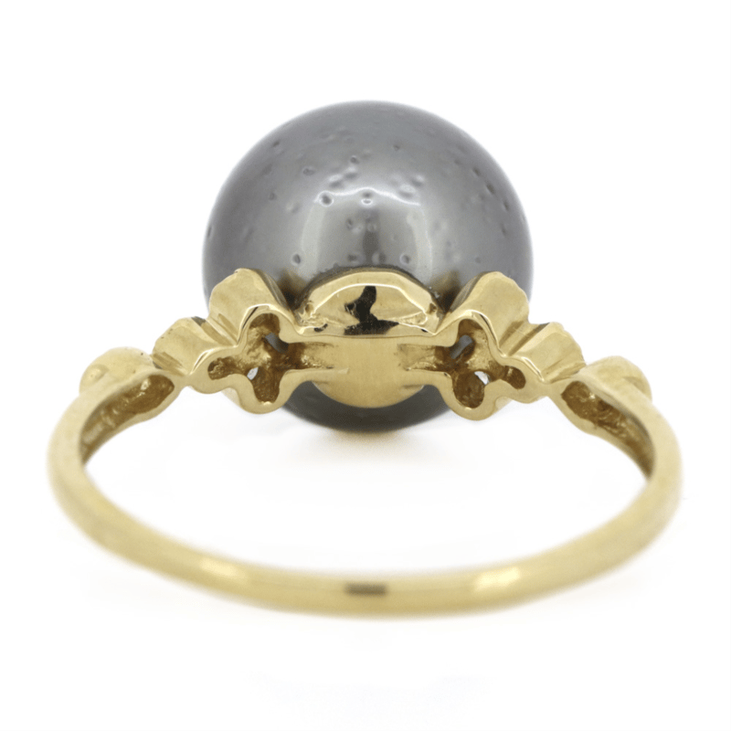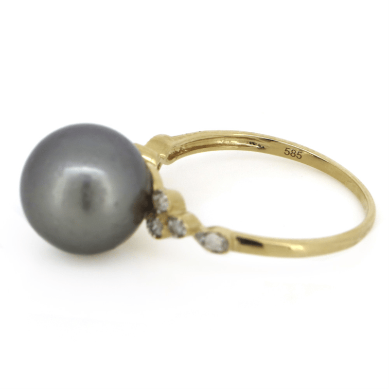 14K YELLOW GOLD, BLACK CULTURED TAHITIAN PEARL AND DIAMOND, DRESS RING. THE DESIGN FEATURES, ONE ROUND, BLACK WITH PURPLE/SILVER OVERTONES, CULTURED TAHITIAN PEAR (10.61MM, MEDIUM LUSTRE, SLIGHTLY BLEMISHED), POST SET. FLANKING THE CENTRE ALONG THE BAND ARE, 8 ROUND BRILLIANT CUT, DIAMONDS (0.11CT TDW, J-K COLOUR, SI2-I2 CLARITY), BEZEL/BEAD SET IN WHITE GOLD WITH MILLEGRAIN DETAIL. RING SIZE N 1/2. Valuations Provided by an Independent Third-Party Professional Not Directly Associated With Lloyds Auctions at AUD $4890This valuation has been conducted by an independent third-party professional. The valuation amount is an assessment by the issuing valuer and does not reflect the auction value of the item. Any inquiries regarding the valuation should be directed to the issuing valuer (refer to contact details on the certificate), as Lloyds Auctions has no affiliation or influence over the valuation, the valuer, or the stated amount. Condition: Good - Refer Images 0645871+1475