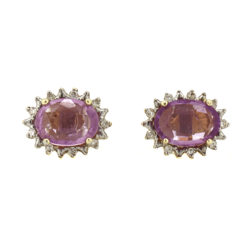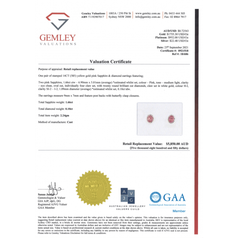 14K YELLOW GOLD, PINK SAPPHIRE AND DIAMOND, HALO STUD EARRINGS. THE CENTRES FEATURE, 2 OVAL CUT, MEDIUM-LIGHT PINK, SAPPHIRES (1.66CT TSW, EYE CLEAN CLARITY), 4 CLAW SET. SURROUNDING THE CENTRES IN HALOS ARE, 20 ROUND BRILLIANT CUT, DIAMONDS (0.10CT TDW, H-I COLOUR, SI2-I2 CLARITY), CLAW SET IN WHITE GOLD. THE EARRINGS HAVE POST BACKS, WITH 14K YELLOW GOLD BUTTERFLY CLASPS. Valuations Provided by an Independent Third-Party Professional Not Directly Associated With Lloyds Auctions at AUD $5850This valuation has been conducted by an independent third-party professional. The valuation amount is an assessment by the issuing valuer and does not reflect the auction value of the item. Any inquiries regarding the valuation should be directed to the issuing valuer (refer to contact details on the certificate), as Lloyds Auctions has no affiliation or influence over the valuation, the valuer, or the stated amount. Condition: Good - Refer Images 0645871+1468