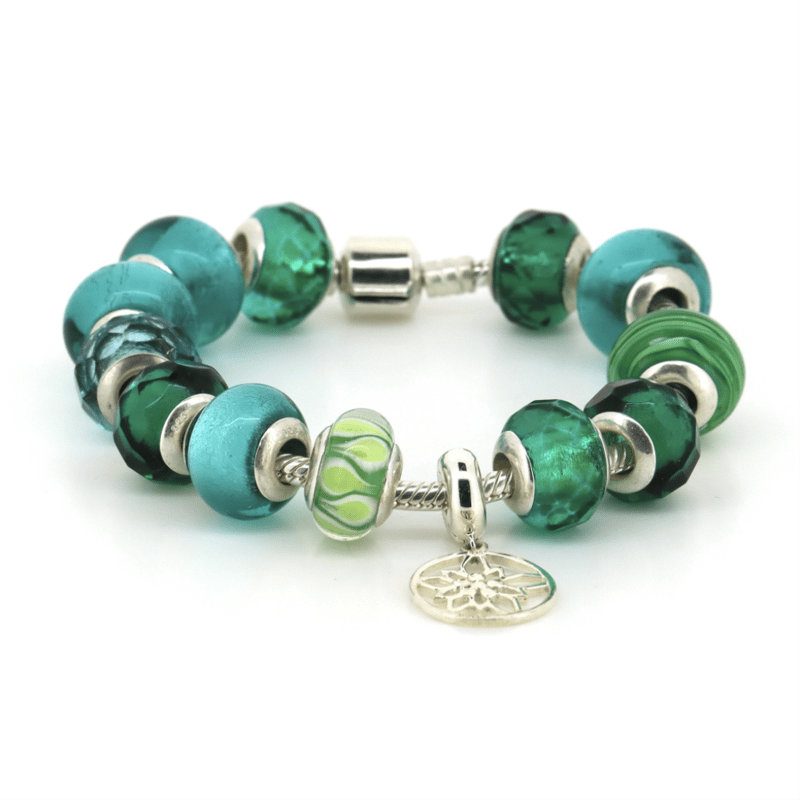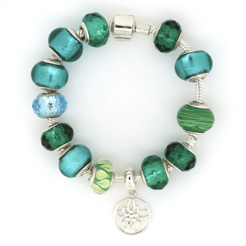 925 STERLING SILVER, MURANO GLASS BEAD AND CHARM BRACELET. THE BRACELET FEATURES, 13 STERLING SILVER AND MURANO GLASS CHARMS. THE STERLING SILVER SNAKE LINK BRACELET HAS A STERLING SILVER SNAP CLASP CLOSURE. TOTAL WEIGHT 46.78 GRAMS.