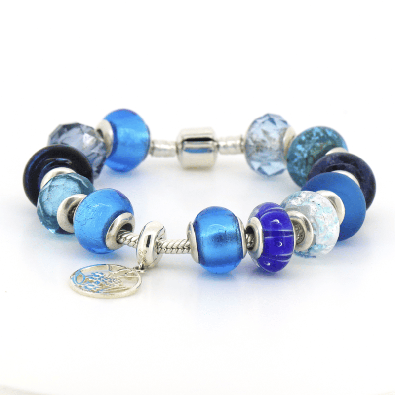 925 STERLING SILVER, MURANO GLASS BEAD AND CHARM BRACELET. THE BRACELET FEATURES, 13 STERLING SILVER AND MURANO GLASS CHARMS. THE STERLING SILVER SNAKE LINK BRACELET HAS A STERLING SILVER SNAP CLASP CLOSURE. TOTAL WEIGHT 49.57 GRAMS.