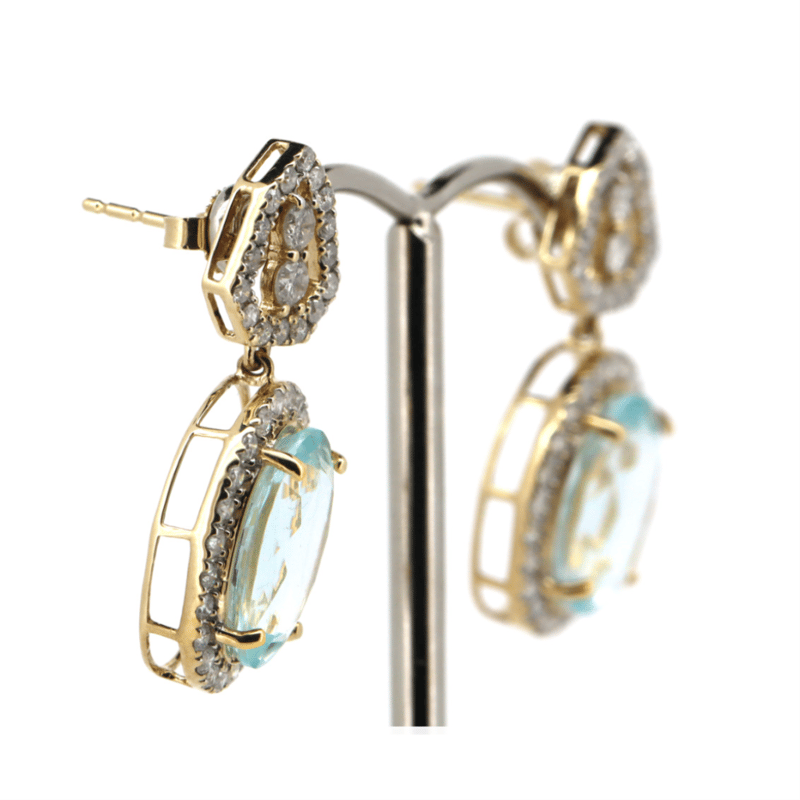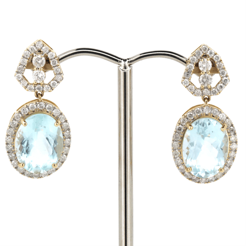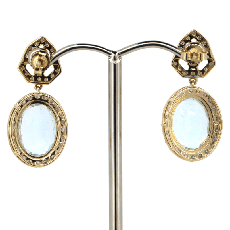 14K YELLOW GOLD, AQUAMARINE AND DIAMOND, HALO DROP EARRINGS. THE CENTRE FEATURES, 2 OVAL MIXED CUT, AQUAMARINES (8.29CT TSW, SLIGHTLY INCLUDED), 4 CLAW SET. ENCOMPASSING THE CENTRE IN A HALO ARE, 84 ROUND BRILLIANT CUT, DIAMONDS (1.25CT TDW, H-K COLOUR, P1+ CLARITY), BEAD SET. THE EARRINGS FEATURE, POST BACKS.