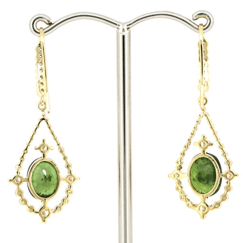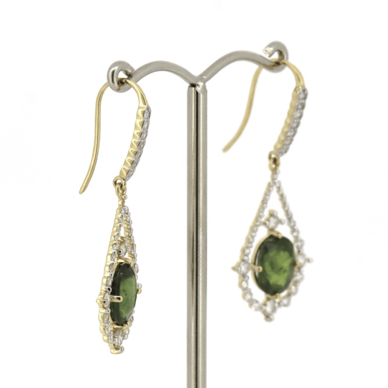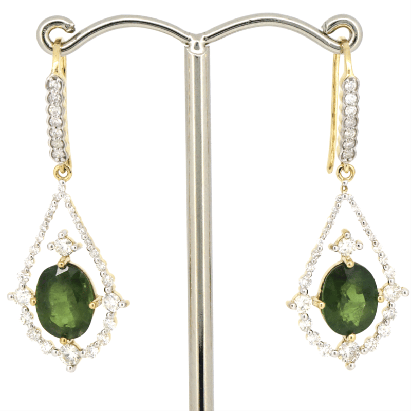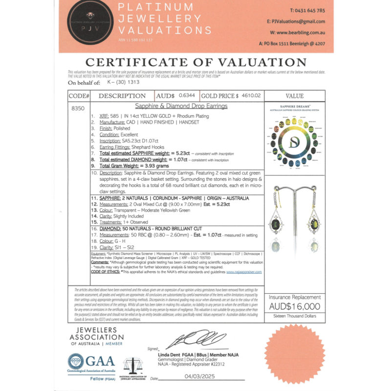 14K YELLOW GOLD, GREEN SAPPHIRE AND DIAMOND, DROP EARRINGS. THE DESIGN FEATURES, TWO OVAL CUT, GREEN SAPPHIRES (5.23CT TSW, SLIGHT INCLUSIONS), 4 CLAW SET. SURROUNDING THE STONES IN HALOS AND DECORATING THE HOOKS ARE, 68 ROUND BRILLIANT CUT, DIAMONDS (1.07CT TDW, G-H COLOUR, SI1-SI2 CLARITY), MICRO-CLAW SET. THE EARRINGS FEATURE SHEPHERD HOOKS.