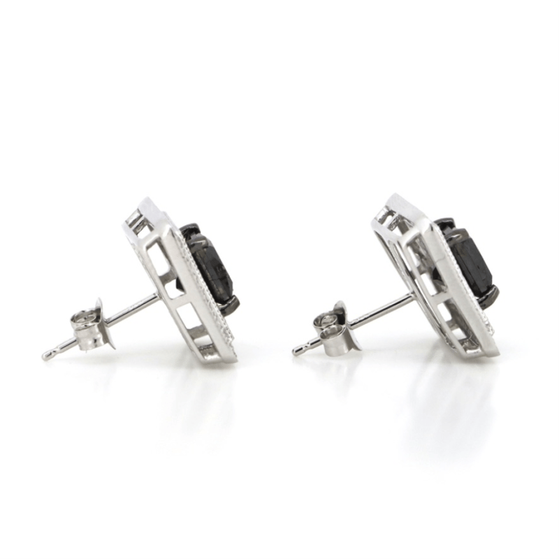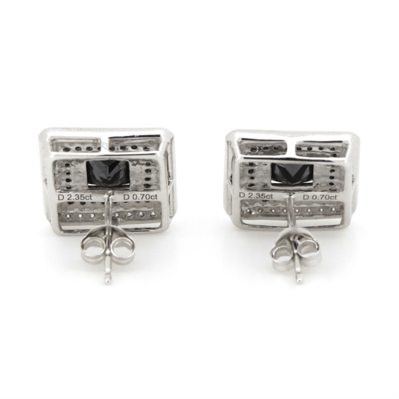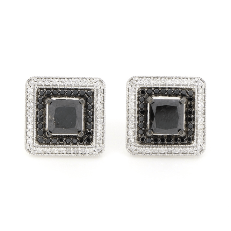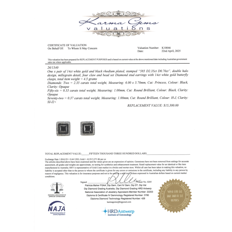 14K WHITE GOLD, BLACK DIAMOND AND DIAMOND, DOUBLE HALO STUD EARRINGS.THE CENTRES FEATURE, 2 PRINCESS CUT, BLACK, DIAMOND (2.35CT TDW, OPAQUE), SET IN 4 CLAW BASKET SETTING. SURROUNDING THE CENTRE IN THE INNERMOST HALO ARE, 56 ROUND BRILLIANT CUT, BLACK, DIAMONDS (0.33CT TDW, OPAQUE), BEAD SET. SURROUNDING THE CENTRE IN THE OUTERMOST HALO ARE, 72 ROUND BRILLIANT CUT, DIAMONDS (0.37CT TDW, H-J COLOUR, SI1-SI2+ CLARITY), BEAD SET. EARRINGS FEATURE BUTTERFLY CLASPS. Valuations Provided by an Independent Third-Party Professional Not Directly Associated With Lloyds Auctions at AUD $$15,300.00This valuation has been conducted by an independent third-party professional. The valuation amount is an assessment by the issuing valuer and does not reflect the auction value of the item. Any inquiries regarding the valuation should be directed to the issuing valuer (refer to contact details on the certificate), as Lloyds Auctions has no affiliation or influence over the valuation, the valuer, or the stated amount. Condition: Good - Refer Images 0645873+147