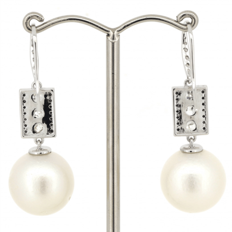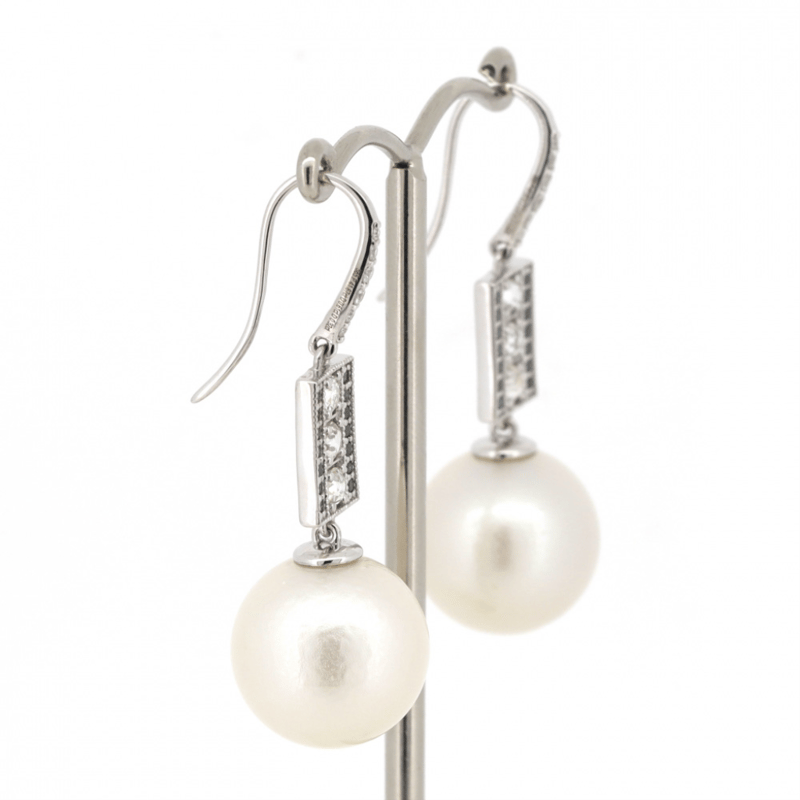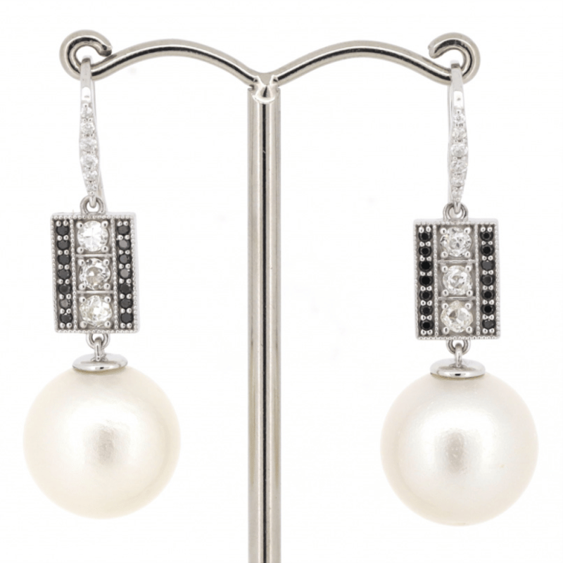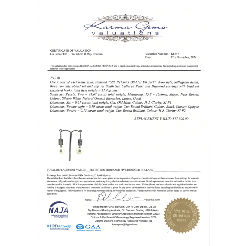 14K WHITE GOLD, WHITE CULTURED SOUTH SEA PEARL AND DIAMOND, DROP EARRINGS. THE DROPS FEATURE, 2 NEAR ROUND, SILVERY WHITE, CULTURED SOUTH SEA PEARLS (15.80MM-16.80MM SIZES, GOOD LUSTRE, NATURAL GROWTH BLEMISHES). DECORATING THE JOINS ARE 6 OLD MINE CUT, DIAMONDS (0.61CT TDW, H-J COLOUR, SI-P1 CLARITY). FLANKING THE JOINS ARE, 28 BLACK DIAMONDS (0.19CT TDW, OPAQUE), CLAW SET. EMBELLISHING THE HOOKS ARE, 12 ROUND BRILLIANT CUT, DIAMONDS (0.13CT TDW, H-J COLOUR, SI-P2 CLARITY), CLAW SET. Valuations Provided by an Independent Third-Party Professional Not Directly Associated With Lloyds Auctions at AUD $$17,500.00This valuation has been conducted by an independent third-party professional. The valuation amount is an assessment by the issuing valuer and does not reflect the auction value of the item. Any inquiries regarding the valuation should be directed to the issuing valuer (refer to contact details on the certificate), as Lloyds Auctions has no affiliation or influence over the valuation, the valuer, or the stated amount. Condition: Good - Refer Images 0645873+144