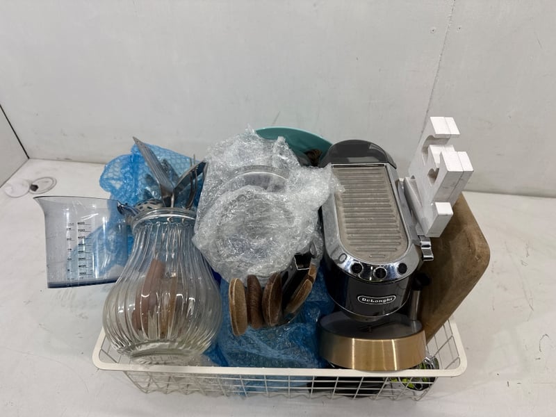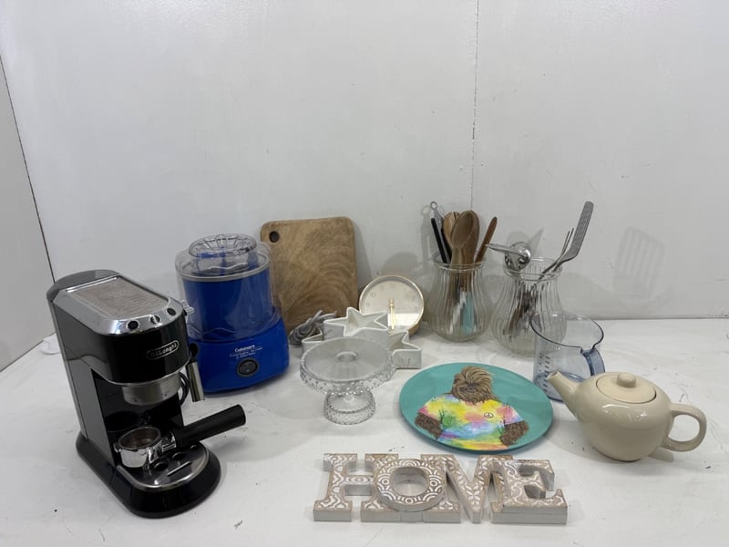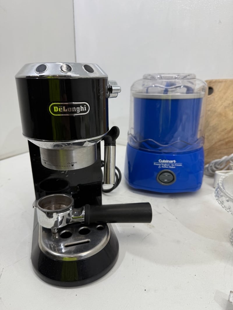 Assorted Kitchen items, Assorted Brand like DeLonghi and Cusinart, Assorted items including Coffee Machine, Frozen yogurt Maker, Cooking Utensils, Cake Stand etc. Quantity 1-Sold as lot