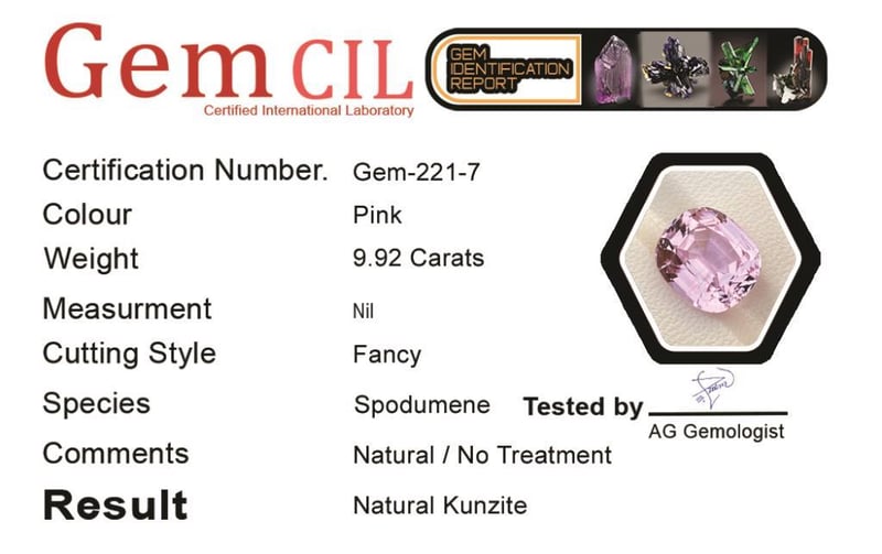 9.92 CARATS NATURAL QUALITY PINK KUNZITE 9.92 Carats Natural Quality Pink Kunzite Stone = Natural KunziteWeight = 9.92 Carats Colour = PinkCut = Fancy Lustre = ExcellentNote = Gem Cil, Certified, Precise Custom Cut (Not Commercial) Condition: Good 0+107