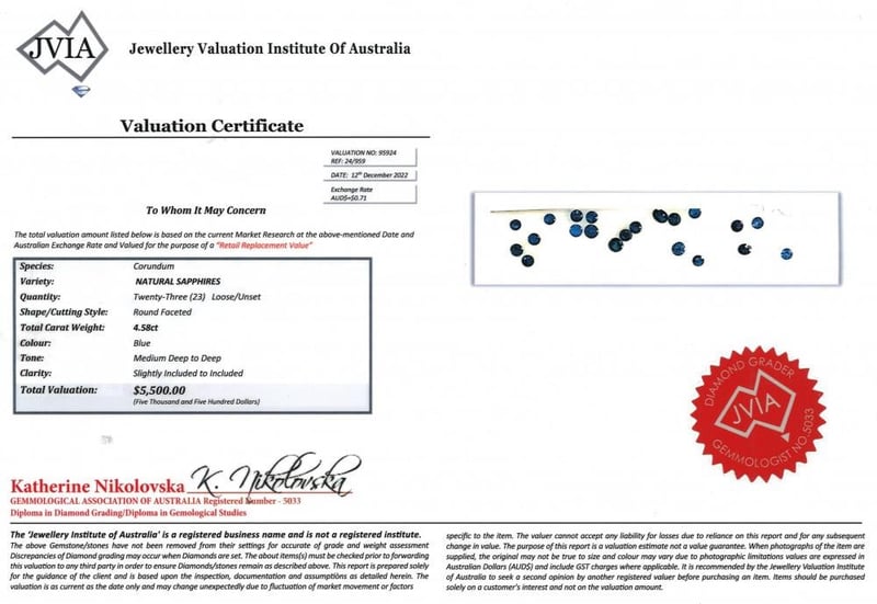 4.58CT TSW X 23 NATURAL BLUE SAPPHIRESRound Faceted Cut, Blue, Slightly Included To Included, Loose, Unset.Condition: Good - Refer To ImagesThis valuation has been conducted by an independent third-party professional. The valuation amount is an assessment by the issuing valuer and does not reflect the auction value of the item.Any inquiries regarding the valuation should be directed to the issuing valuer (refer to contact details on the certificate), as Lloyds Auctions has no affiliation or influence over the valuation, the valuer, or the stated amount.Insurance Replacement Valuation Amount: $5,500.00586057+10