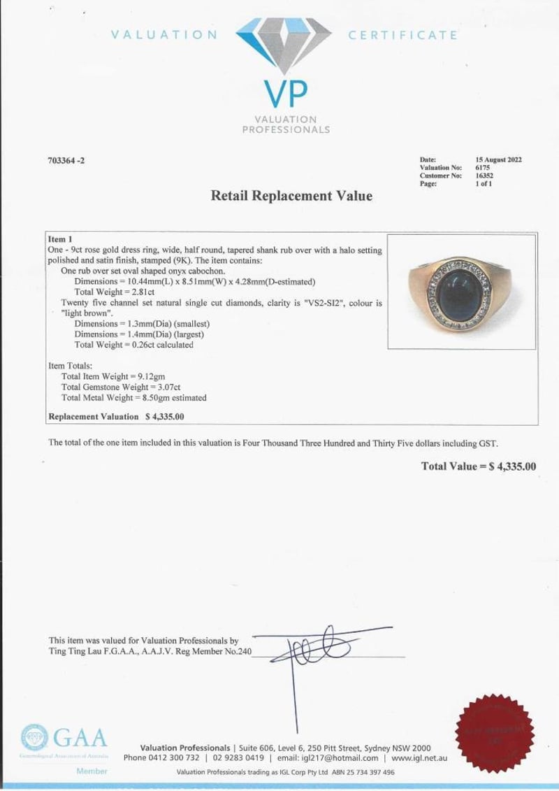 9K ROSE GOLD 3.07 CARAT GENTS DIAMOND & ONYX RING 1 Oval Natural Onyx = 2.81 Carats 25 Brilliant Natural Diamond = 0.26 Carat Ring Weight = 9.13 Grams Finger Size T ( Size 10 ) Valuations Provided by an Independent Third-Party Professional Not Directly Associated With Lloyds Auctions at AUD $4335 This valuation has been conducted by an independent third-party professional. The valuation amount is an assessment by the issuing valuer and does not reflect the auction value of the item. Any inquiries regarding the valuation should be directed to the issuing valuer (refer to contact details on the certificate), as Lloyds Auctions has no affiliation or influence over the valuation, the valuer, or the stated amount. Condition: Good - Refer Images 0 488962+1