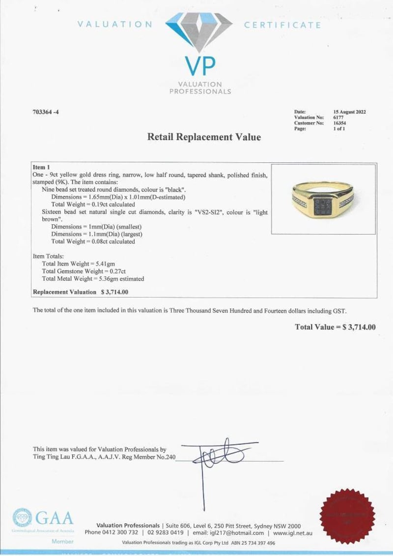9K YELLOW GOLD 0.27 CARAT GENTS DIAMOND RING 9 Black Diamond = 0.19 Carats 16 Brilliant Natural Diamond = 0.08 Carat Ring Weight = 5.43 Grams Finger Size T ( Size 10 ) Valuations Provided by an Independent Third-Party Professional Not Directly Associated With Lloyds Auctions at AUD $3714This valuation has been conducted by an independent third-party professional. The valuation amount is an assessment by the issuing valuer and does not reflect the auction value of the item. Any inquiries regarding the valuation should be directed to the issuing valuer (refer to contact details on the certificate), as Lloyds Auctions has no affiliation or influence over the valuation, the valuer, or the stated amount. Condition: Good - Refer Images 0488962+3