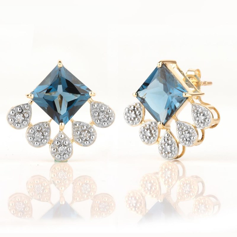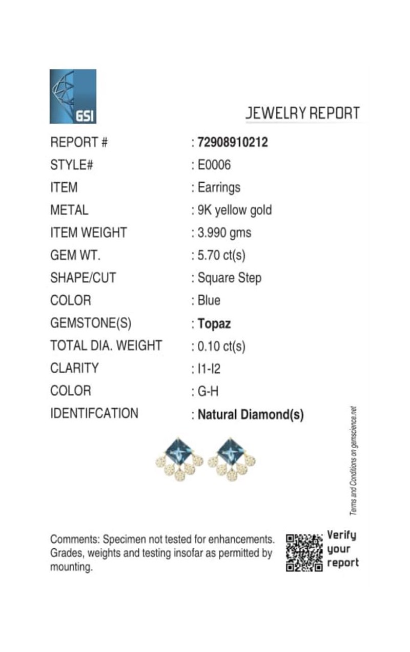 9CT YELLOW GOLD NATURAL LONDON BLUE TOPAZ & DIAMOND EARRINGS Weight Of The Item: 3.99 GFineness Of Metal(S): Yellow Gold 9KtThe Earrings Consists Of (2) Square Brilliant Natural London Blue Topaz. Surrounding The Main Stones Are Round Brilliant Cut Natural Diamonds.Identification: Natural London Blue TopazColor: BlueShape: Square Brilliant CutNo. Of Stone: 2Dimension: 8 Mm X 8 Mm X 4.8 MmWeight: 5.7 CaratsCut: Very GoodIdentification: Natural DiamondShape: Round Brilliant CutWeight: 0.1 CtsCertificates Are Provided By Gemological Science International (Gsi), An Independent Third-Party Gemological Laboratory Based In The Usa And Recognised Among The Top 10 Gem Labs Globally Condition: Good - Refer Images 0160841+37