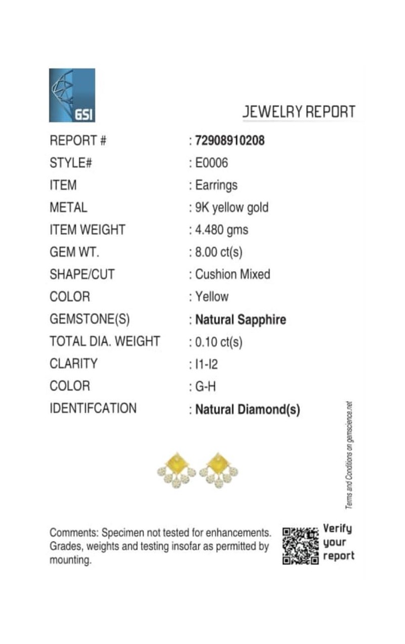 9CT YELLOW GOLD NATURAL YELLOW SAPPHIRE & DIAMOND EARRINGS Weight Of The Item: 4.48 GFineness Of Metal(S): Yellow Gold 9KtThe Earrings Consists Of (2) Cushion Brilliant Natural Yellow Sapphire. Surrounding The Main Stones Are Round Brilliant Cut Natural Diamonds.Identification: Natural Yellow SapphireColor: YellowShape: Cushion Brilliant CutNo. Of Stone: 2Dimension: 8 Mm X 8 Mm X 4.8 MmWeight: 8 CaratsCut: Very GoodIdentification: Natural DiamondShape: Round Brilliant CutWeight: 0.1 CtsCertificates Are Provided By Gemological Science International (Gsi), An Independent Third-Party Gemological Laboratory Based In The Usa And Recognised Among The Top 10 Gem Labs Globally Condition: Good - Refer Images 0160841+35