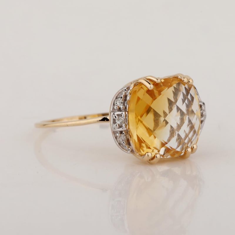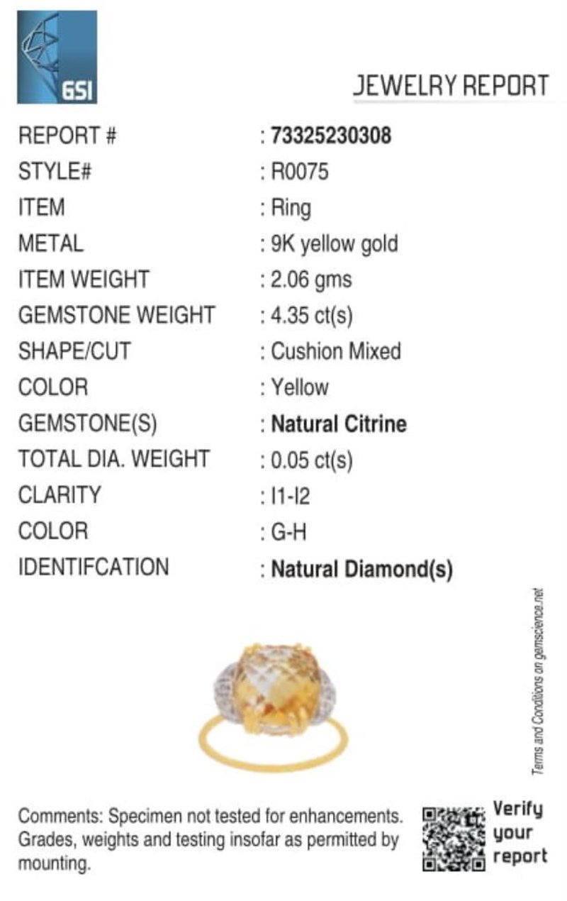 9CT YELLOW GOLD NATURAL CITRINE & DIAMOND RING Weight Of The Item: 2.06 G Fineness Of Metal(S): Yellow Gold 9Kt The Ring Consists Of (1) Cushion Brilliant Natural Citrine. Surrounding The Main Stones Are Round Brilliant Cut Natural Diamonds. Antique Style Identification: Natural Citrine Color: Yellow Shape: Cushion Brilliant Cut No. Of Stone: 1 Dimension: 10 Mm X 10 Mm X 6 Mm Weight: 4.35 Carats Cut: Very Good Identification: Natural Diamond Shape: Round Brilliant Cut Weight: 0.05 Cts Cut: Excellent. Certificates Are Provided By Gemological Science International (Gsi), An Independent Third-Party Gemological Laboratory Based In The Usa And Recognised Among The Top 10 Gem Labs Globally Markings: 9ct Condition: Good - Refer Images 0 488238+87