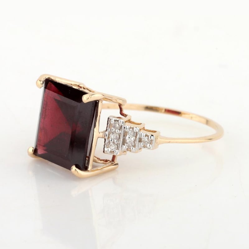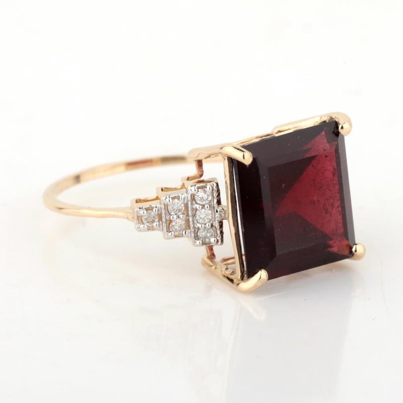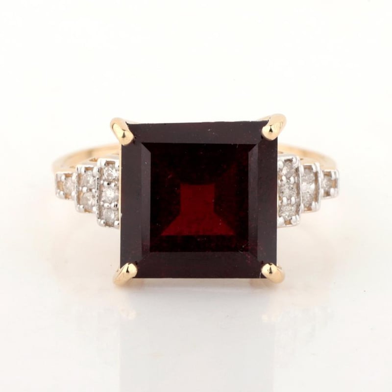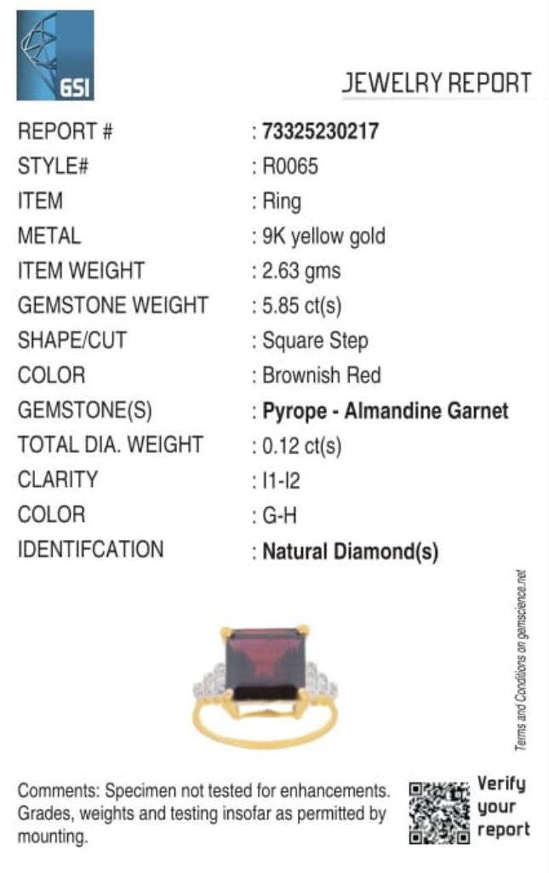 9CT YELLOW GOLD NATURAL GARNET & DIAMOND RING Weight Of The Item: 2.63 GFineness Of Metal(S): Yellow Gold 9KtThe Ring Consists Of (1) Square Brilliant Natural Garnet. Surrounding The Main Stones Are Round Brilliant Cut Natural Diamonds.Antique StyleIdentification: Natural GarnetColor: RedShape: Square Brilliant CutNo. Of Stone: 1Dimension: 10 Mm X 10 Mm X 6 MmWeight: 5.85 CaratsCut: Very GoodIdentification: Natural DiamondShape: Round Brilliant CutWeight: 0.12 CtsCut: Excellent. Certificates Are Provided By Gemological Science International (Gsi), An Independent Third-Party Gemological Laboratory Based In The Usa And Recognised Among The Top 10 Gem Labs Globally Markings: 9ct Condition: Good - Refer Images 0488238+64