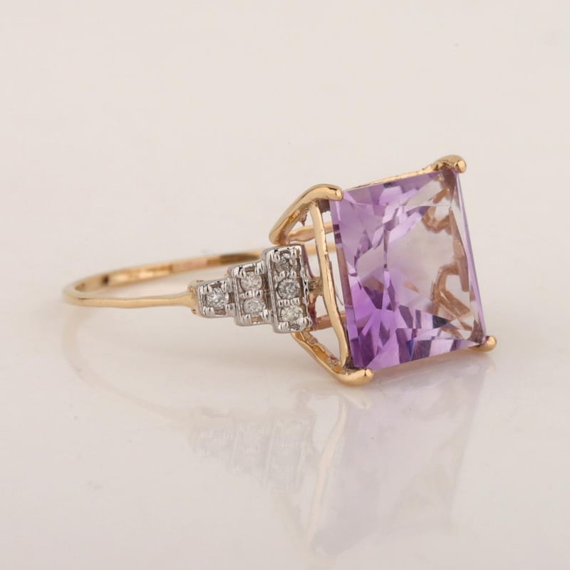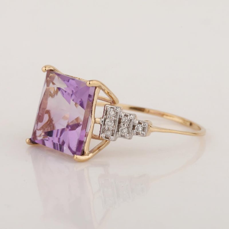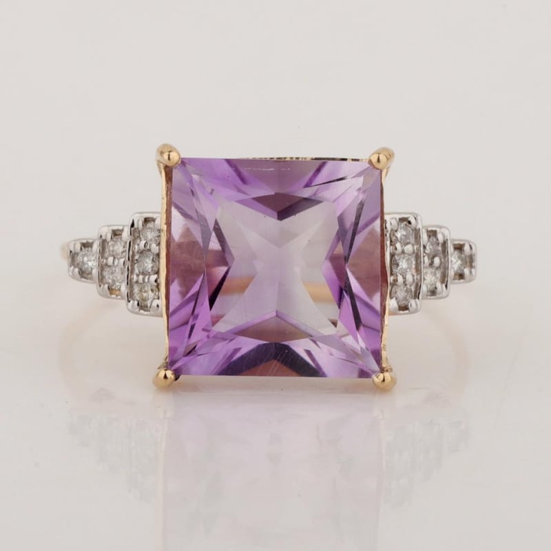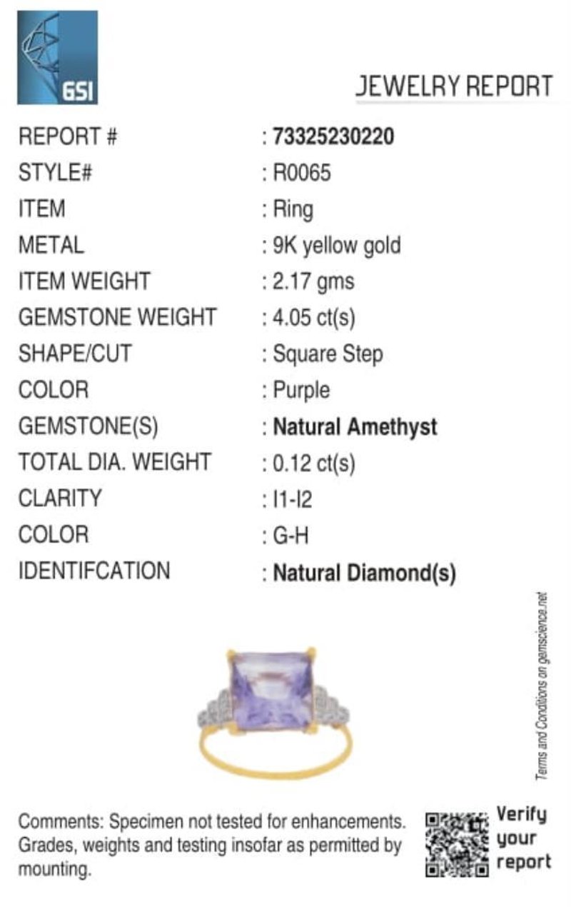 9CT YELLOW GOLD NATURAL AMETHYST & DIAMOND RING Weight Of The Item: 2.17 GFineness Of Metal(S): Yellow Gold 9KtThe Ring Consists Of (1) Square Brilliant Natural Amethyst. Surrounding The Main Stones Are Round Brilliant Cut Natural Diamonds.Antique StyleIdentification: Natural AmethystColor: PurpleShape: Square Brilliant CutNo. Of Stone: 1Dimension: 10 Mm X 10 Mm X 6 MmWeight: 4.05 CaratsCut: Very GoodIdentification: Natural DiamondShape: Round Brilliant CutWeight: 0.12 CtsCut: Excellent. Certificates Are Provided By Gemological Science International (Gsi), An Independent Third-Party Gemological Laboratory Based In The Usa And Recognised Among The Top 10 Gem Labs Globally Markings: 9ct Condition: Good - Refer Images 0488238+68