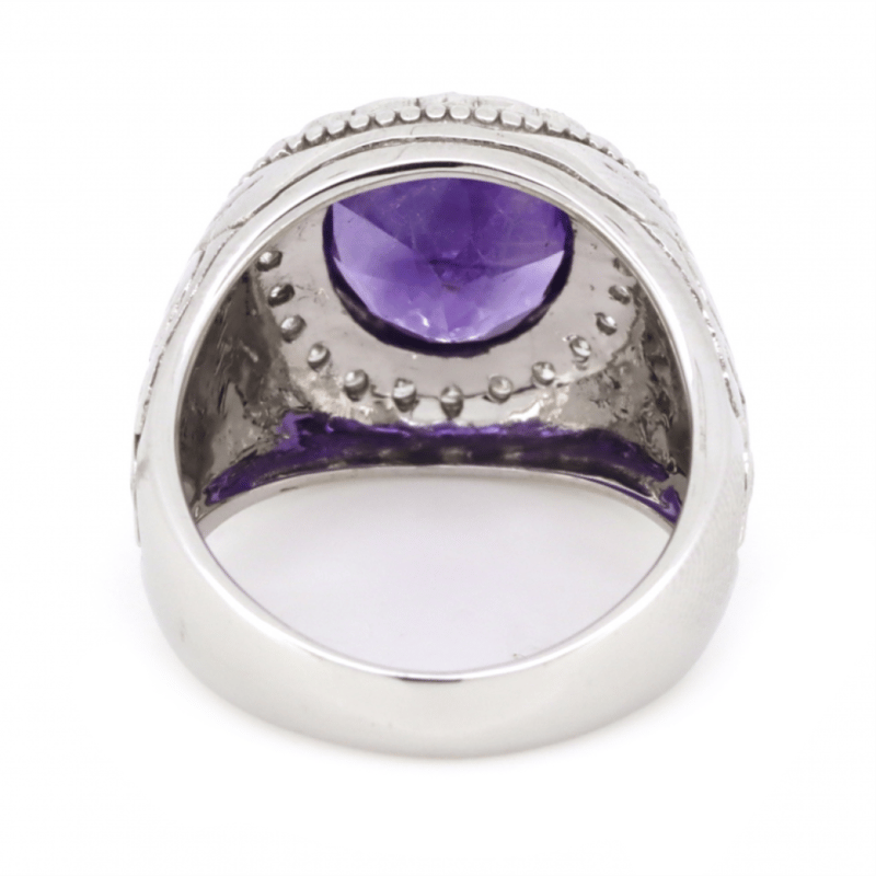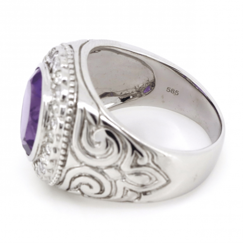 14K WHITE GOLD, AMETHYST AND DIAMOND, DRESS RING. THE CENTRE FEATURES, ONE OVAL CUT, MEDIUM PURPLE, AMETHYST (3.98CT, EYE CLEAN CLARITY), BEZEL SET. SURROUNDING THE CENTRE IN A HALO ARE, 24 ROUND BRILLIANT CUT, DIAMONDS (0.53CT TDW, H-I COLOUR, SI1-I2 CLARITY), BEAD SET. THE SHOULDERS ARE DECORATED WITH FILIGREE DESIGNS. RING SIZE P 1/2. Valuations Provided by an Independent Third-Party Professional Not Directly Associated With Lloyds Auctions at AUD $$9,590.00This valuation has been conducted by an independent third-party professional. The valuation amount is an assessment by the issuing valuer and does not reflect the auction value of the item. Any inquiries regarding the valuation should be directed to the issuing valuer (refer to contact details on the certificate), as Lloyds Auctions has no affiliation or influence over the valuation, the valuer, or the stated amount. Condition: Good - Refer Images 0645858+1643