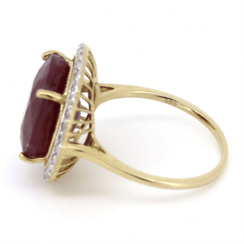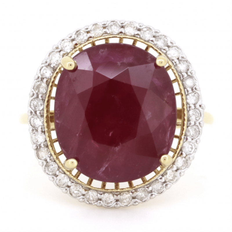 14K YELLOW GOLD, RUBY AND DIAMOND, HALO RING. THE CENTRE FEATURES, ONE OVAL CUT, PURPLISH-RED, RUBY (9.74CT, INCLUDED), 4 CLAW SET. SURROUNDING THE CENTRE IN A HALO ARE, 31 ROUND BRILLIANT CUT, DIAMONDS (0.29CT TDW, J-K COLOUR, SI2-I2 CLARITY), BEAD SET IN WHITE GOLD. RING SIZE M. THE RUBY HAS NATURAL INCLUSIONS THAT HAVE REACHED THE SURFACE. Valuations Provided by an Independent Third-Party Professional Not Directly Associated With Lloyds Auctions at AUD $$15,290.00This valuation has been conducted by an independent third-party professional. The valuation amount is an assessment by the issuing valuer and does not reflect the auction value of the item. Any inquiries regarding the valuation should be directed to the issuing valuer (refer to contact details on the certificate), as Lloyds Auctions has no affiliation or influence over the valuation, the valuer, or the stated amount. Condition: Good - Refer Images 0645858+1698