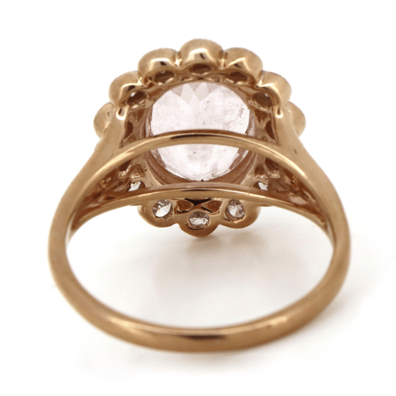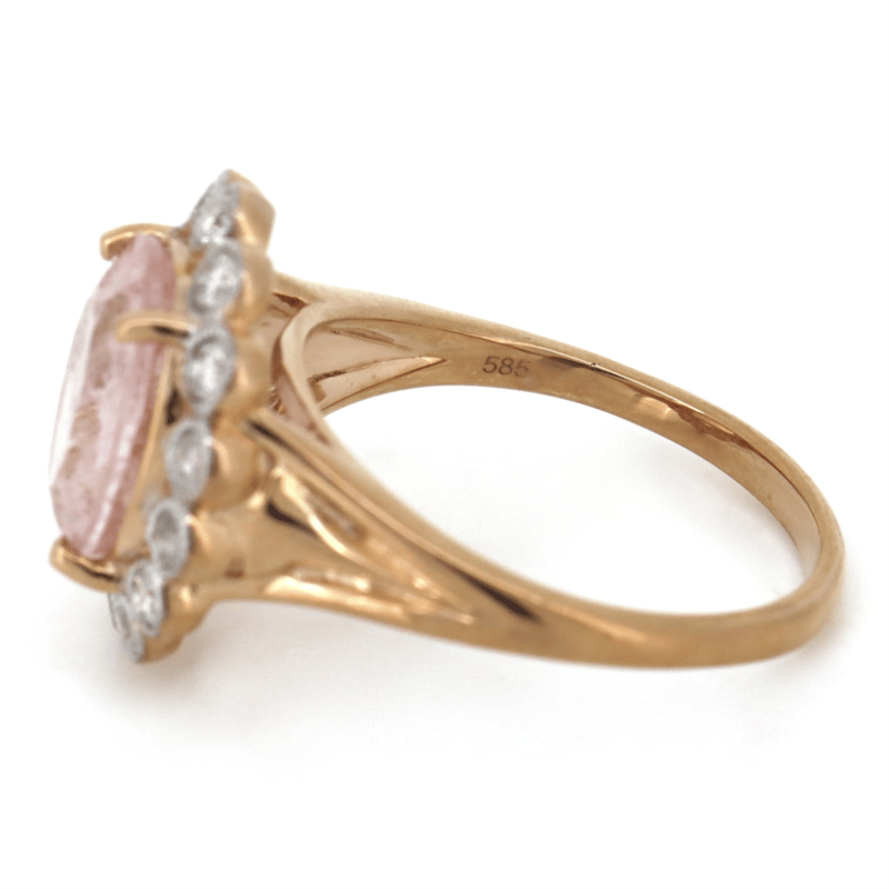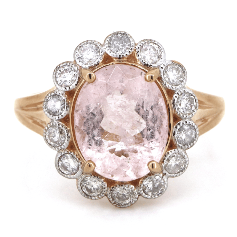 14K ROSE GOLD, MORGANITE AND DIAMOND, HALO RING. THE CENTRE FEATURES, ONE OVAL FACETED CUT, LIGHT-MEDIUM PINK, MORGANITE (3.01CT, INCLUDED), 4 CLAW SET. SURROUNDING THE CENTRE IN A SCALLOPED HALO DESIGN ARE, 14 ROUND BRILLIANT CUT, DIAMONDS (0.62CT TDW, J-K COLOUR, P1-P2 CLARITY), BEZEL SET WITH MILLEGRAIN DETAIL. THE BEZEL SETTING HAS BEEN 14K WHITE GOLD RHODIUM PLATED, TO ACHIEVE A TWO-TONE EFFECT. RING SIZE P 1/2. Valuations Provided by an Independent Third-Party Professional Not Directly Associated With Lloyds Auctions at AUD $$9,800.00This valuation has been conducted by an independent third-party professional. The valuation amount is an assessment by the issuing valuer and does not reflect the auction value of the item. Any inquiries regarding the valuation should be directed to the issuing valuer (refer to contact details on the certificate), as Lloyds Auctions has no affiliation or influence over the valuation, the valuer, or the stated amount. Condition: Good - Refer Images 0645858+1640