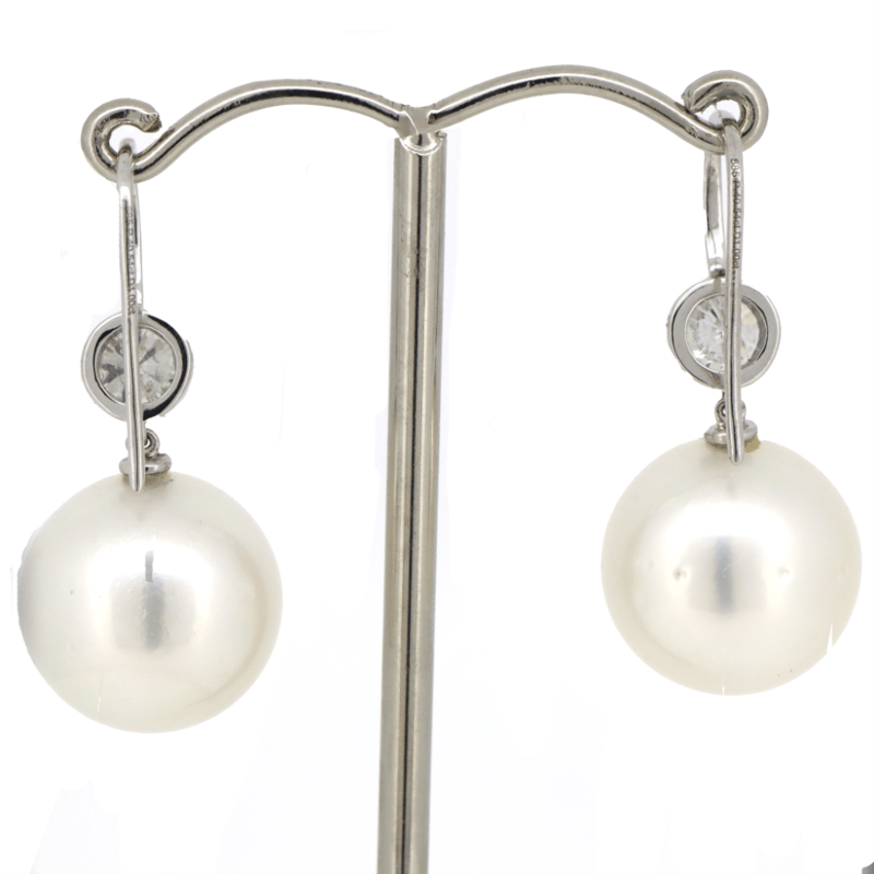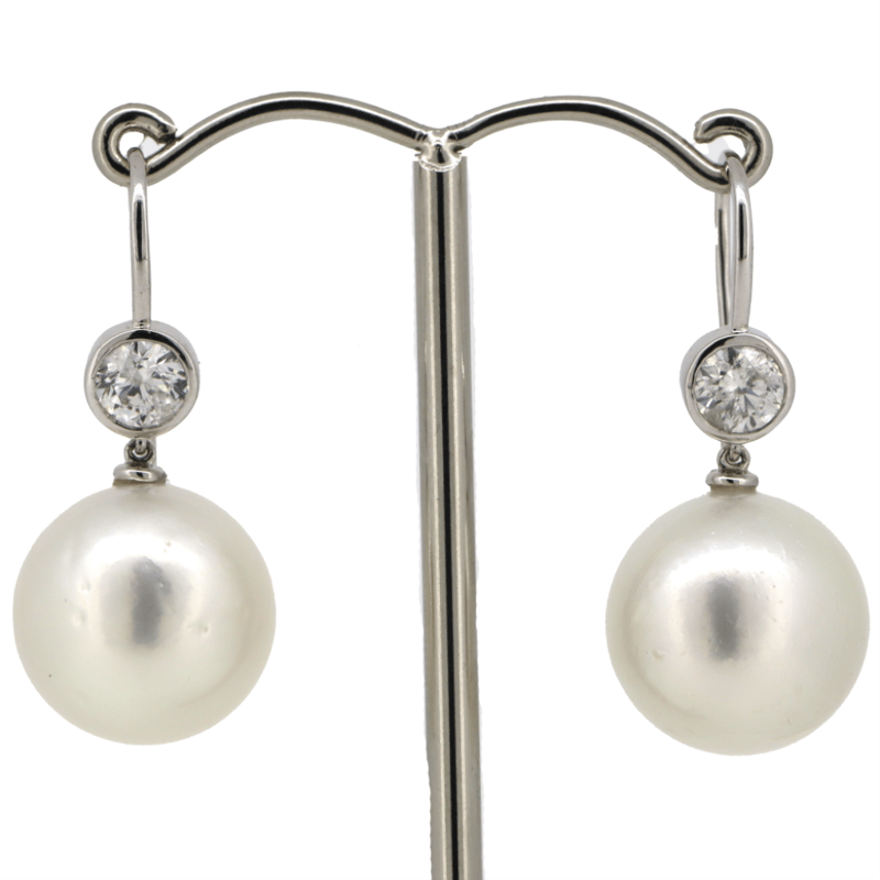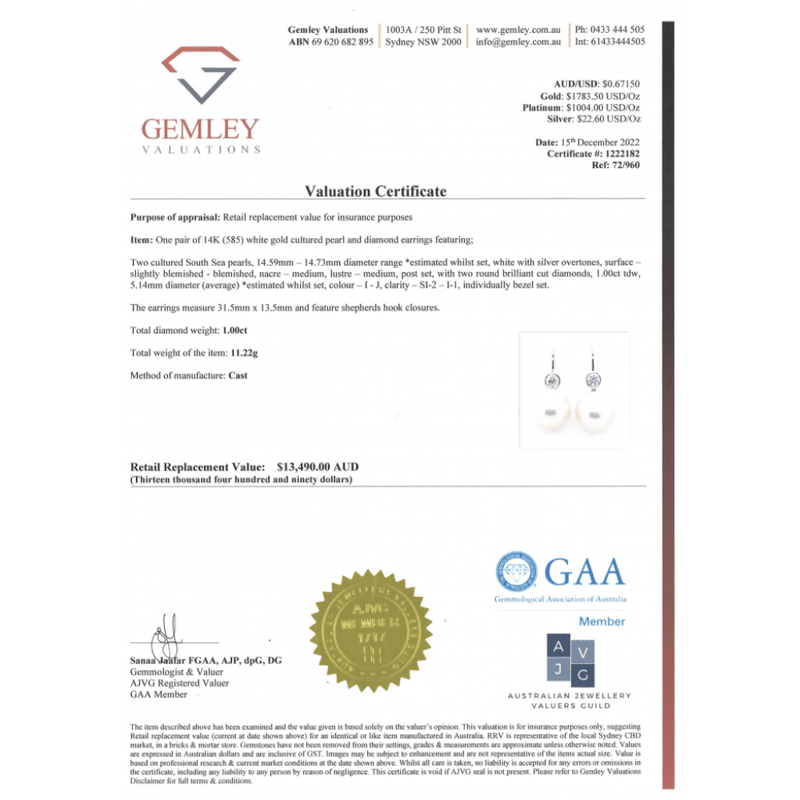 14K WHITE GOLD, WHITE CULTURED SOUTH SEA PEARL AND DIAMOND, DROP EARRINGS. THE DROPS FEATURES, 2 NEAR ROUND, WHITE WITH SILVER OVERTONES, CULTURED SOUTH SEA PEARLS (14.59MM-14.73MM SIZE, MEDIUM LUSTRE, SLIGHTLY BLEMISHED-BLEMISHED), POST SET. SURMOUNTING THE DROPS ARE, 2 ROUND BRILLIANT CUT, DIAMONDS (1.00CT TDW, I-J COLOUR, SI2-I1 CLARITY), BEZEL SET. THE EARRINGS HAVE SHEPHERD HOOKS. Valuations Provided by an Independent Third-Party Professional Not Directly Associated With Lloyds Auctions at AUD $$13,490.00This valuation has been conducted by an independent third-party professional. The valuation amount is an assessment by the issuing valuer and does not reflect the auction value of the item. Any inquiries regarding the valuation should be directed to the issuing valuer (refer to contact details on the certificate), as Lloyds Auctions has no affiliation or influence over the valuation, the valuer, or the stated amount. Condition: Good - Refer Images 0645858+1601