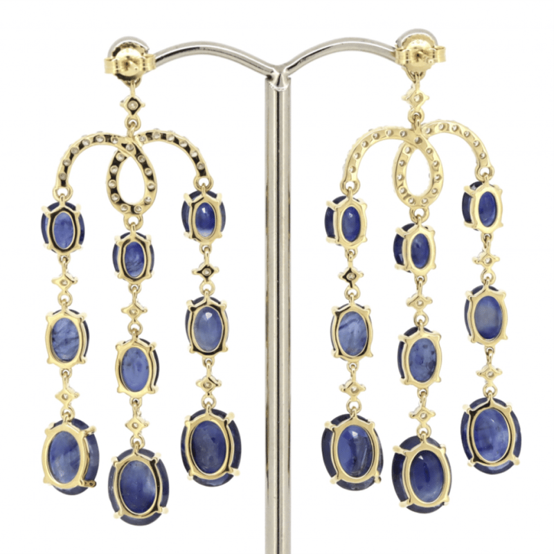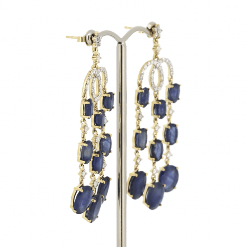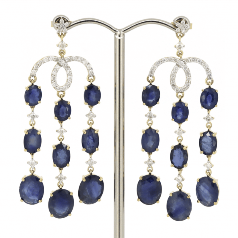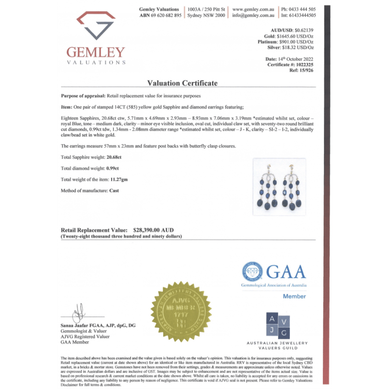 14K YELLOW GOLD, BLUE SAPPHIRE AND DIAMOND, CHANDELIER EARRINGS. THE DESIGN FEATURES, 18 OVAL CUT, ROYAL BLUE, SAPPHIRES (20.68CT TSW, MINOR EYE VISIBLE INCLUSIONS), CLAW SET. ACCOMPANYING THE DESIGN ARE, 72 ROUND BRILLIANT CUT, DIAMONDS (0.99CT TDW, J-K COLOUR, SI2-I2 CLARITY), CLAW/BEAD SET IN WHITE GOLD. THE EARRINGS HAVE POST BACKS, WITH 14K YELLOW GOLD BUTTERFLY CLASPS. Valuations Provided by an Independent Third-Party Professional Not Directly Associated With Lloyds Auctions at AUD $$28,390.00This valuation has been conducted by an independent third-party professional. The valuation amount is an assessment by the issuing valuer and does not reflect the auction value of the item. Any inquiries regarding the valuation should be directed to the issuing valuer (refer to contact details on the certificate), as Lloyds Auctions has no affiliation or influence over the valuation, the valuer, or the stated amount. Condition: Good - Refer Images 0645858+1638