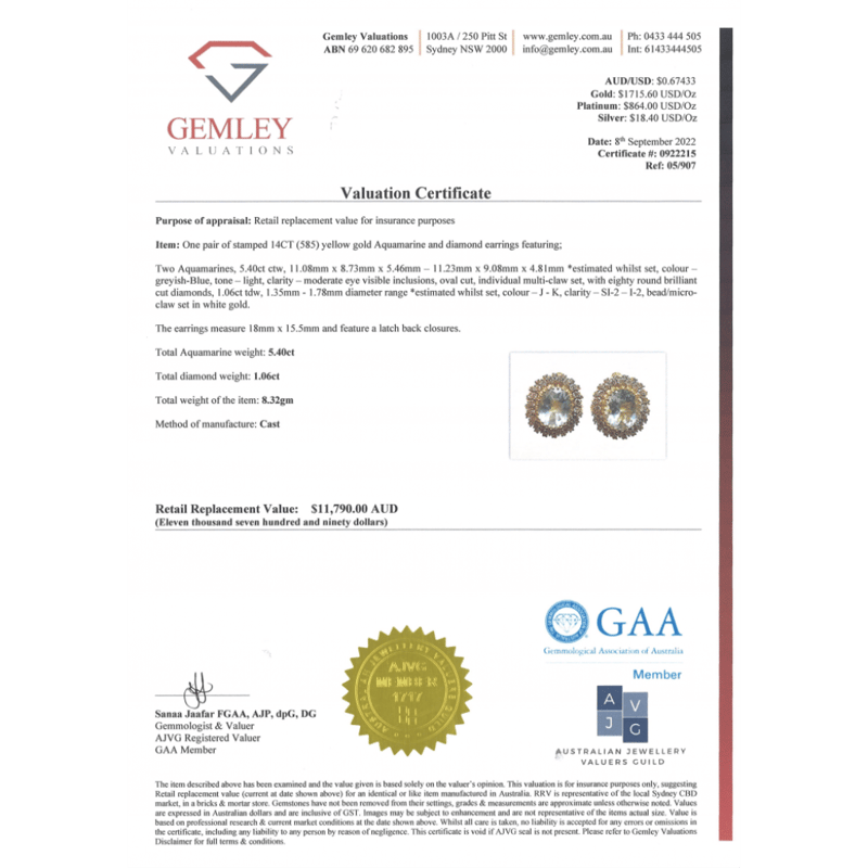 14K YELLOW GOLD, AQUAMARINE AND DIAMOND, ANTIQUE INSPIRED EARRINGS. THE CENTRES FEATURE, 2 OVAL CUT, LIGHT GREYISH-BLUE, AQUAMARINES (5.40CT TSW, MODERATE EYE VISIBLE INCLUSIONS), CLAW SET. SURROUNDING THE CENTRES IN DECORATIVE HALOS ARE, 80 ROUND BRILLIANT CUT, DIAMONDS (1.06CT TDW, J-K COLOUR, SI2-I2 CLARITY), BEAD/MICRO-CLAW SET IN WHITE GOLD. THE EARRINGS HAVE LATCH BACK CLOSURES. Valuations Provided by an Independent Third-Party Professional Not Directly Associated With Lloyds Auctions at AUD $$11,790.00This valuation has been conducted by an independent third-party professional. The valuation amount is an assessment by the issuing valuer and does not reflect the auction value of the item. Any inquiries regarding the valuation should be directed to the issuing valuer (refer to contact details on the certificate), as Lloyds Auctions has no affiliation or influence over the valuation, the valuer, or the stated amount. Condition: Good - Refer Images 0645858+1610