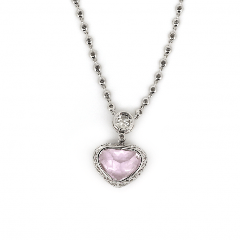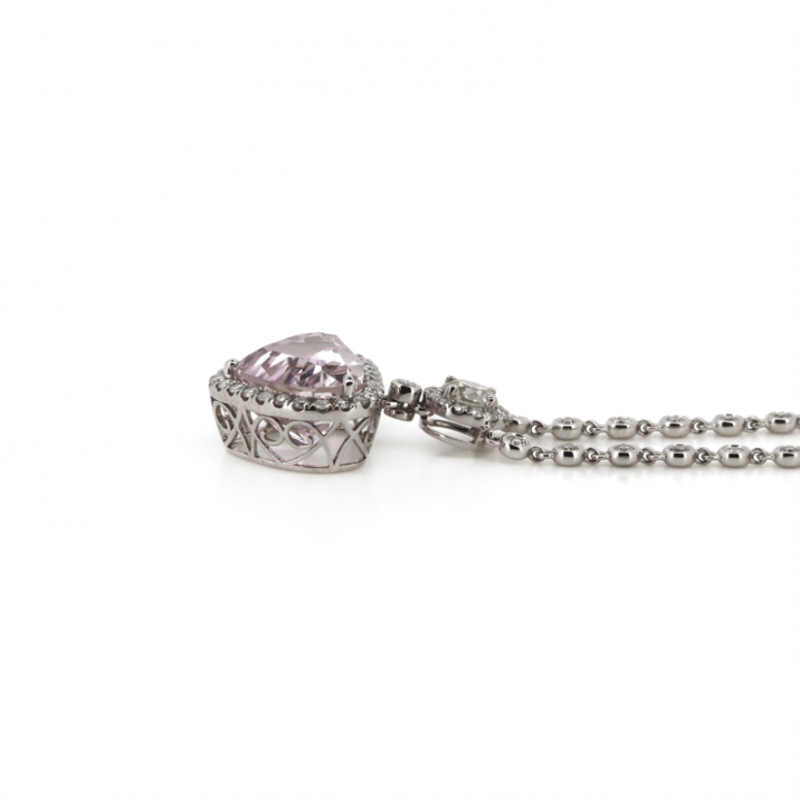 14K WHITE GOLD, 7.59CT KUNZITE AND DIAMOND, STATEMENT NECKLACE. THE PENDANT FEATURES, ONE TRILLION CUT, LIGHT PINKISH-PURPLE, KUNZITE (7.59CT, MINOR EYE VISIBLE INCLUSIONS), CLAW SET. SURMOUNTED BY, ONE ROUND BRILLIANT CUT, DIAMOND (0.48CT, J-K COLOUR, SI2 CLARITY), CLAW SET. ENCOMPASSING THE KUNZITE AND DIAMOND AND DECORATING THE CHAIN ARE, 66 ROUND BRILLIANT CUT, DIAMONDS (1.01CT TDW, J-K COLOUR, SI2-I2 CLARITY), BEZEL/MICRO-CLAW SET. THE NECKLACE HAS A LOBSTER CLAW CLASP. CHAIN LENGTH IS 48CM (ADJUSTABLE). Valuations Provided by an Independent Third-Party Professional Not Directly Associated With Lloyds Auctions at AUD $$14,890.00This valuation has been conducted by an independent third-party professional. The valuation amount is an assessment by the issuing valuer and does not reflect the auction value of the item. Any inquiries regarding the valuation should be directed to the issuing valuer (refer to contact details on the certificate), as Lloyds Auctions has no affiliation or influence over the valuation, the valuer, or the stated amount. Condition: Good - Refer Images 0645858+1699