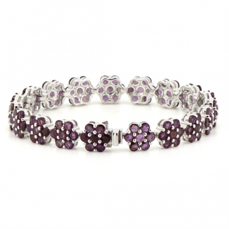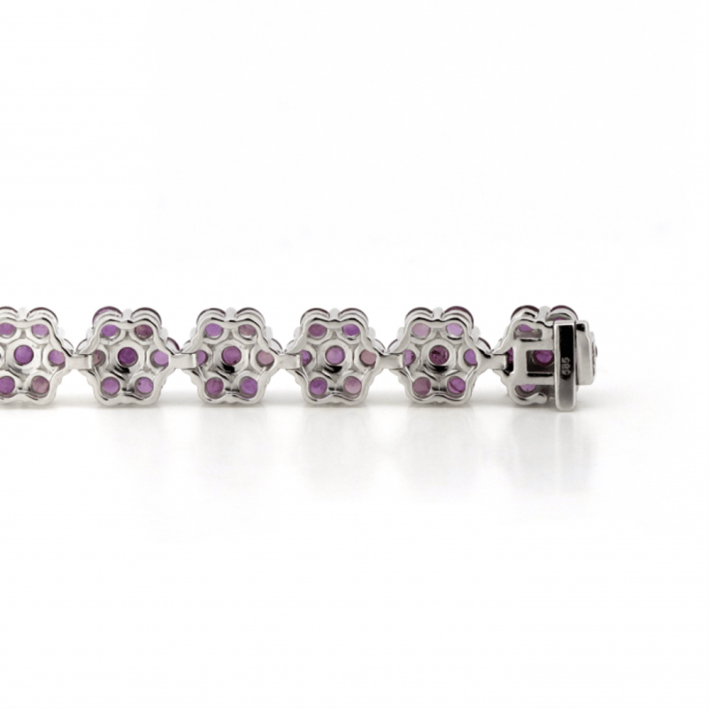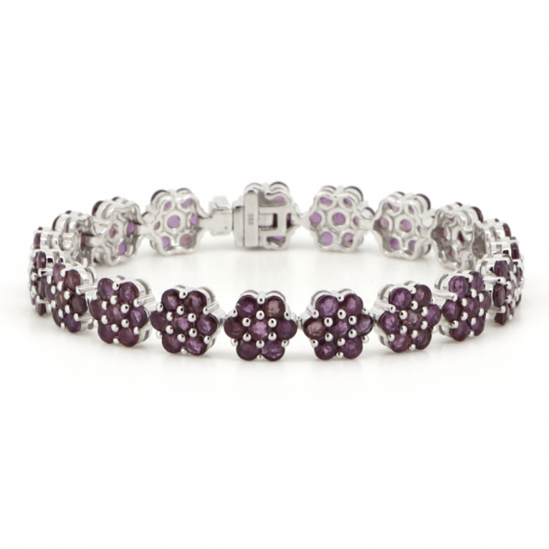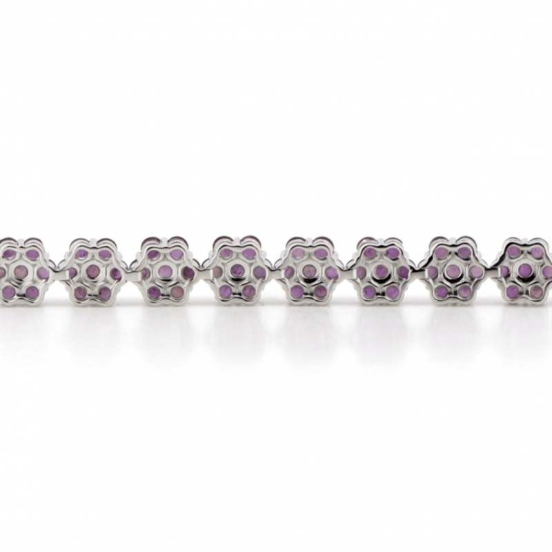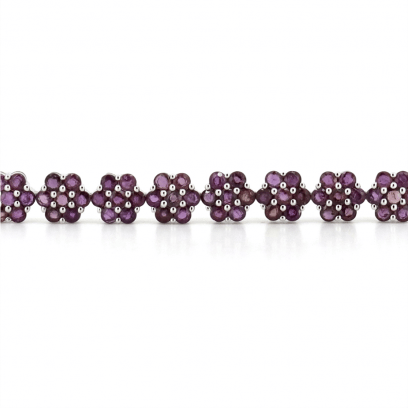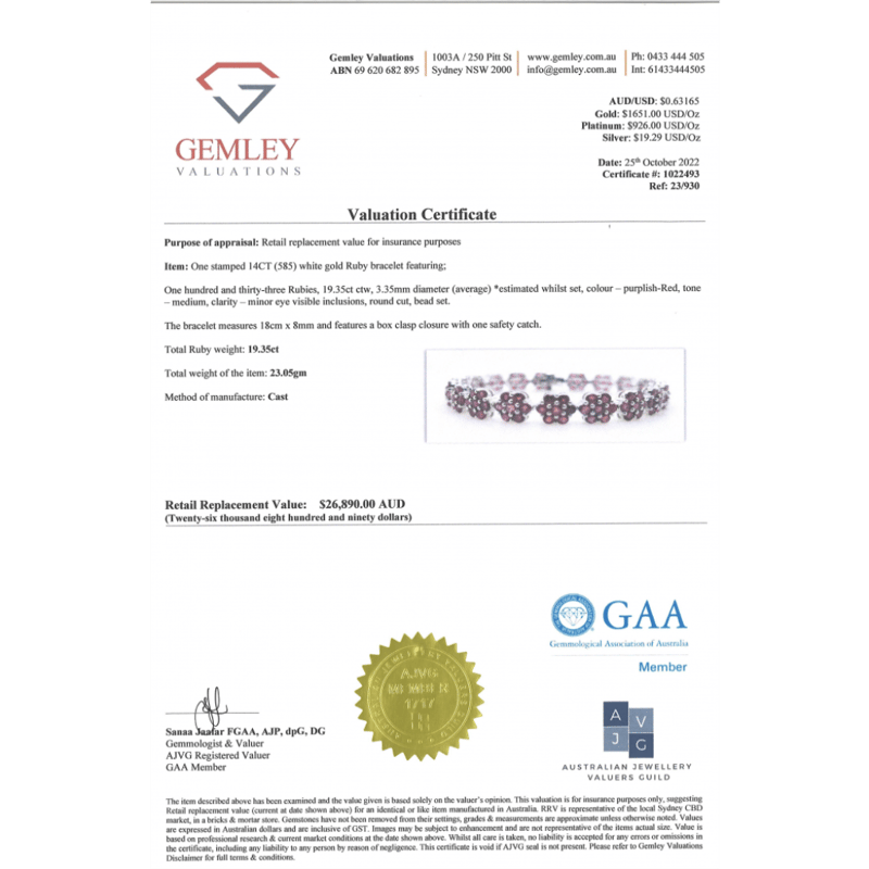 14K WHITE GOLD AND RUBY, FLORAL BRACELET. THE DESIGN FEATURES, 133 ROUND CUT, MEDIUM PINKISH-RED, RUBIES (19.35CT TSW, MINOR EYE VISIBLE INCLUSIONS), BEAD SET. THE BRACELET HAS BOX CLASP, WITH SAFETY LATCH. THE BRACELET LENGTH IS 18.5CM. Valuations Provided by an Independent Third-Party Professional Not Directly Associated With Lloyds Auctions at AUD $$26,890.00This valuation has been conducted by an independent third-party professional. The valuation amount is an assessment by the issuing valuer and does not reflect the auction value of the item. Any inquiries regarding the valuation should be directed to the issuing valuer (refer to contact details on the certificate), as Lloyds Auctions has no affiliation or influence over the valuation, the valuer, or the stated amount. Condition: Good - Refer Images 0645858+1689