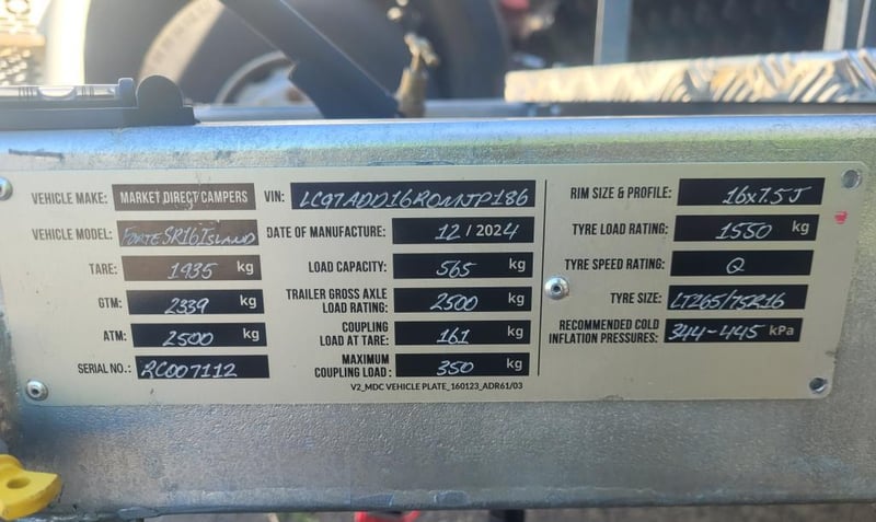 Description: 50mm tow ball hitch, hand brake, 12 pin flat adapter, 2x LPG bottle holders, jockey wheel, awning, double bed, dining area, kitchenette including sink and tap, running water, 3 burner stove top, microwave, audio system, fridge, bathroom including sink and mixer, toilet, separate shower, air conditioning, plenty of storage, original books and manuals