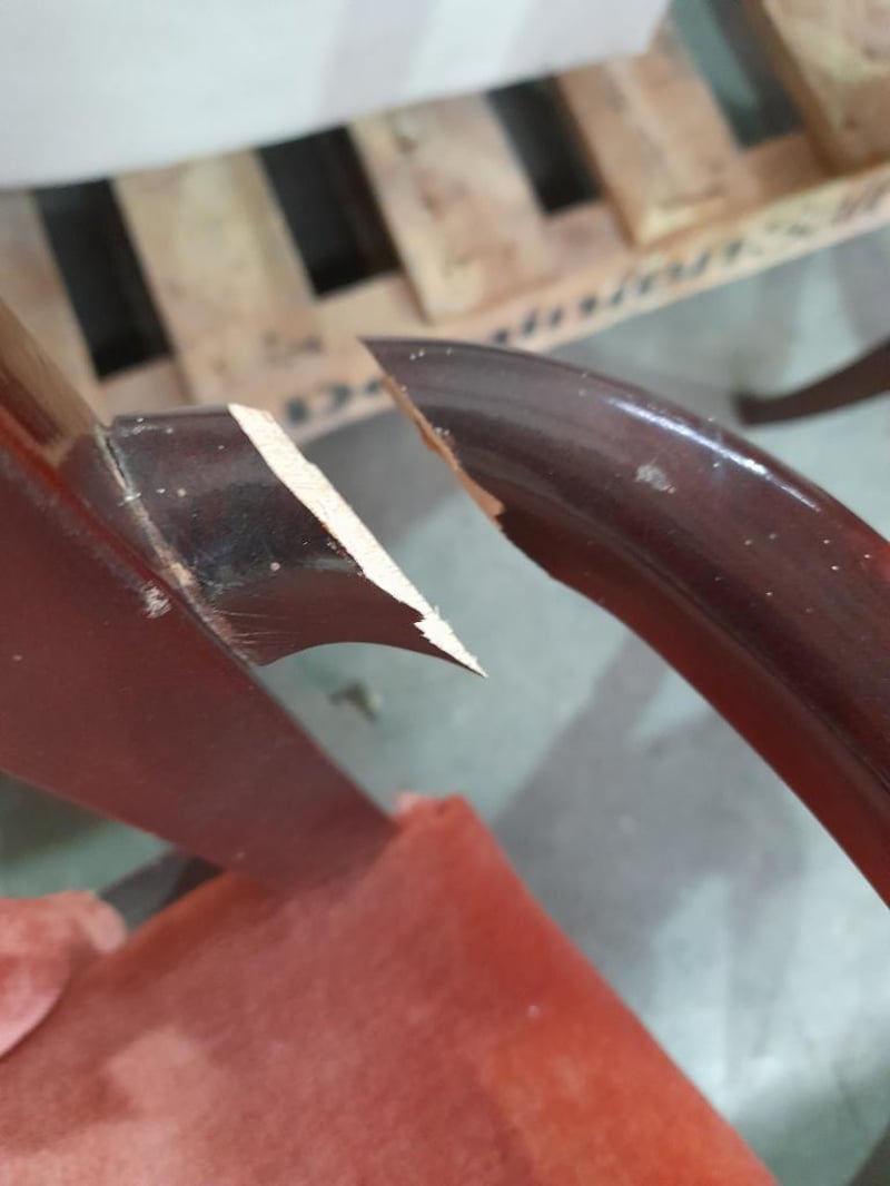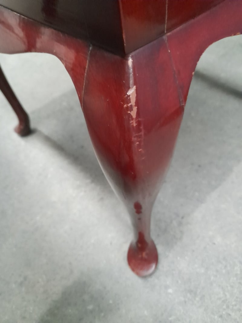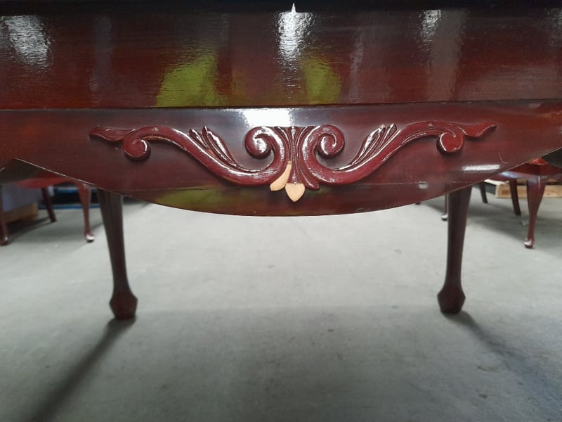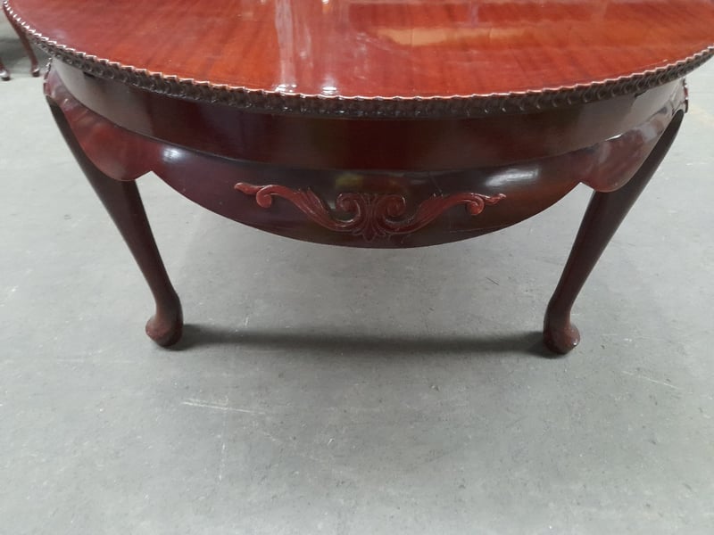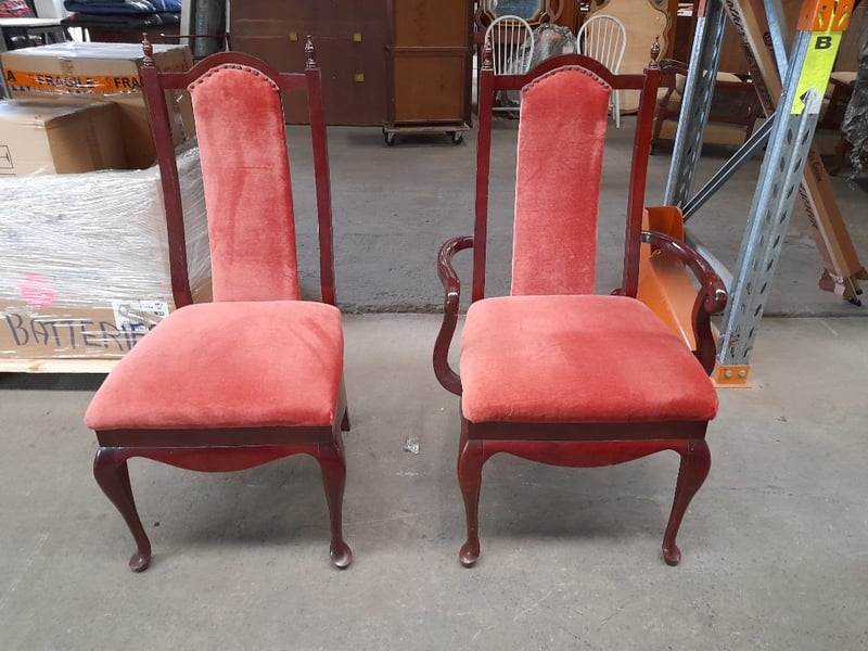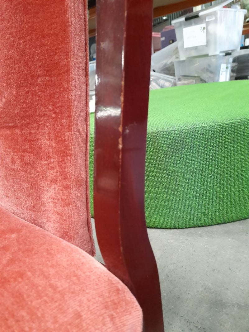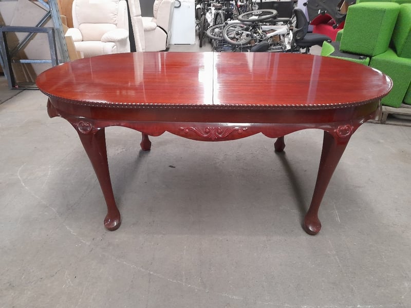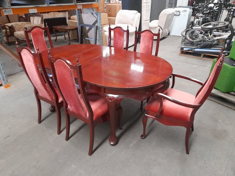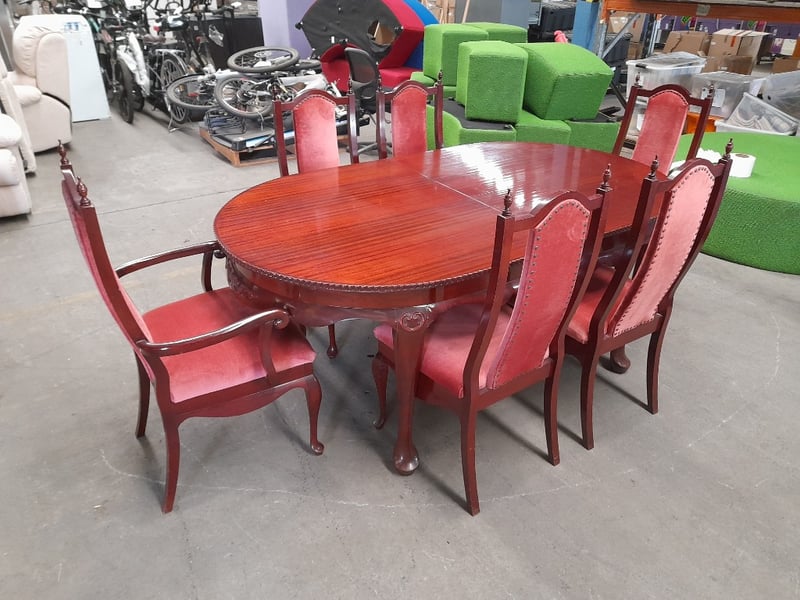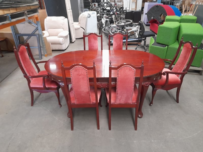 Extendable oval table & 6 chairs, mahogany finish, red velvet upholsteryTable dims: 77 × 186 × 109cmChair dims: 106 × 62 × 58cmNote: Minor wear on chairs, 2 chairs have small structural impairments, small chip on table, refer to imagesSold as lot