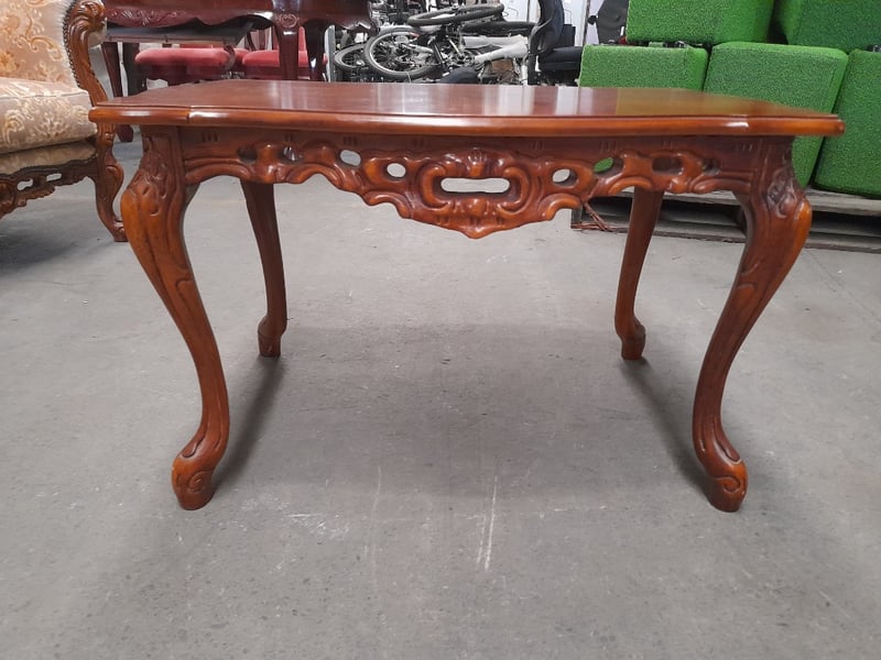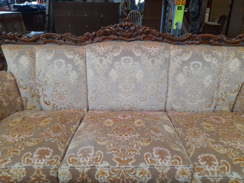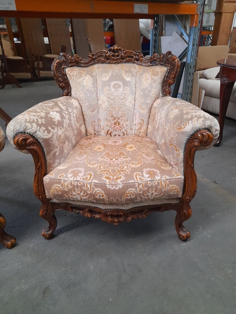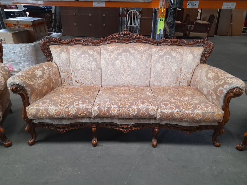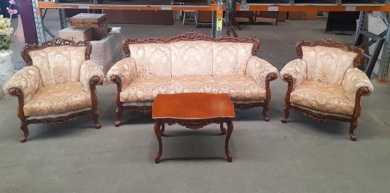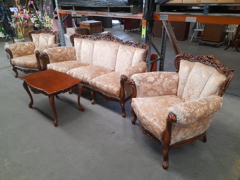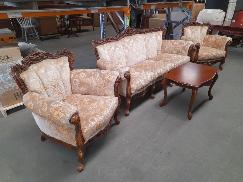 Three-seater sofa, two armchairs & coffee table, ornate carved wood & brocade upholsterySofa dims: 98 × 198 × 84cmArmchair dims: 94 × 96 × 84cmTable dims: 51 × 83 × 54cmSold as lot