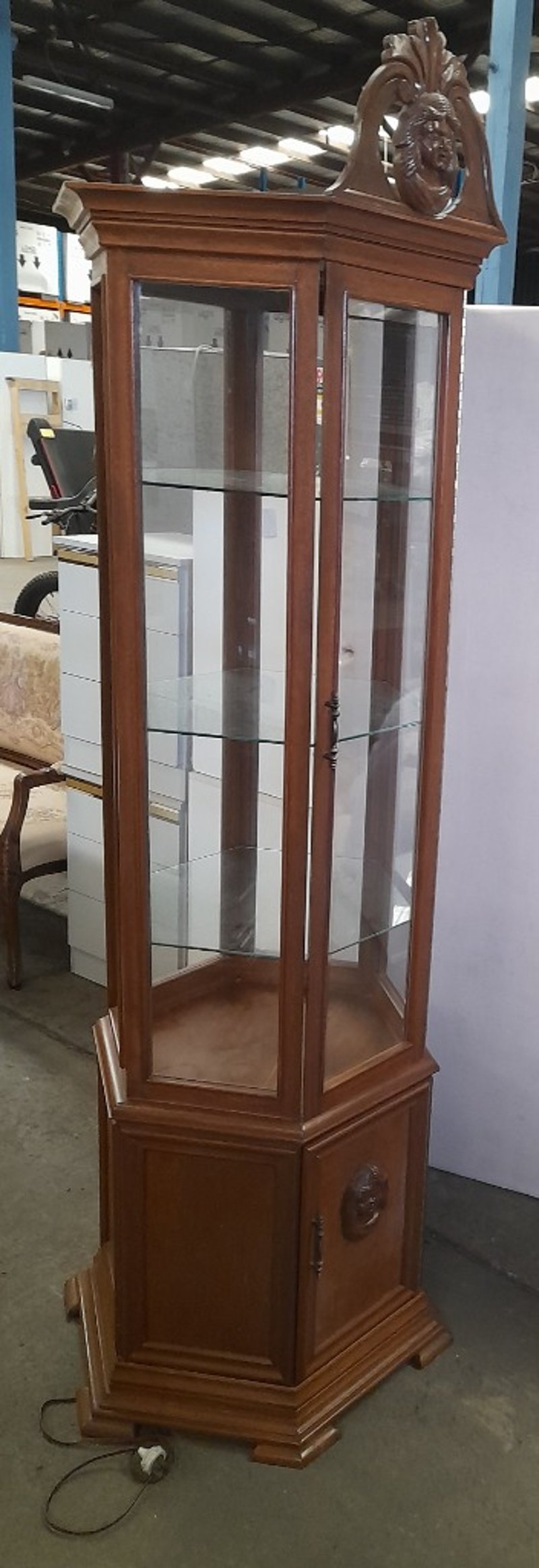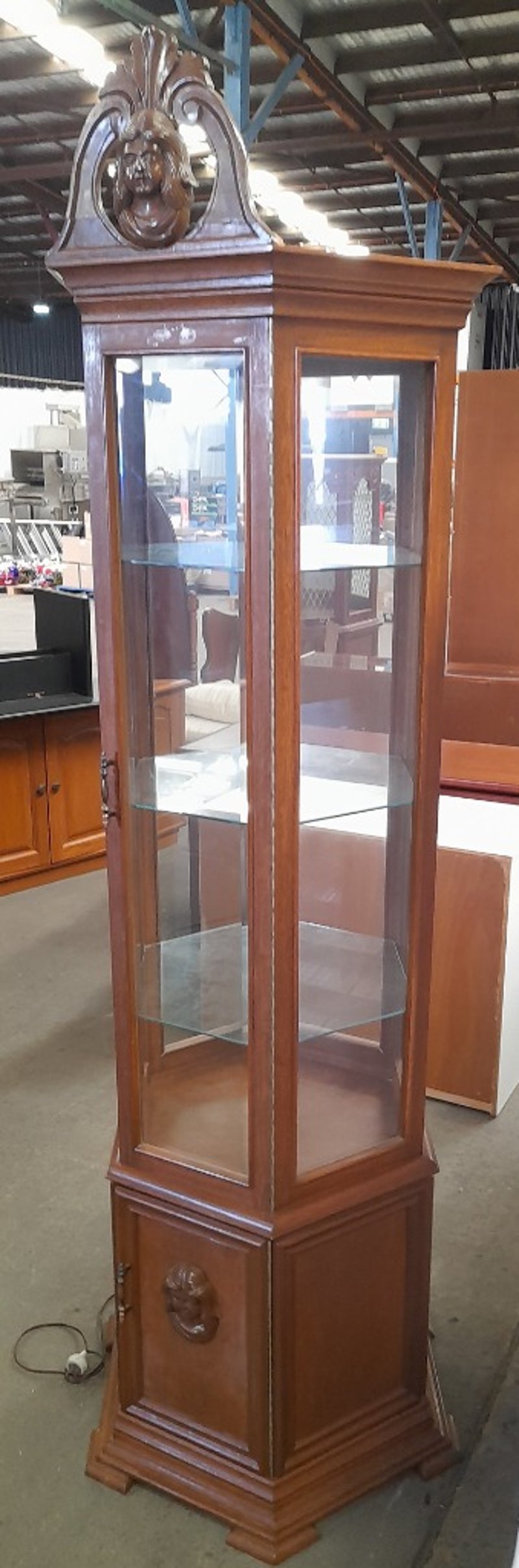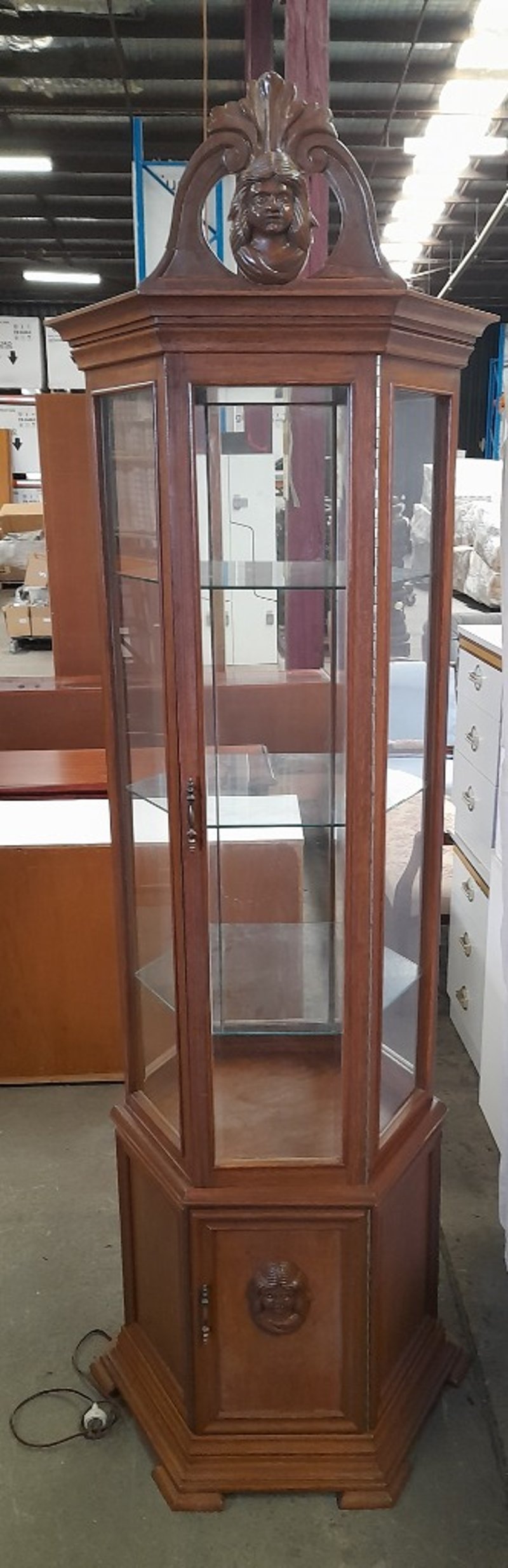 Cabinet, wooden hexagonal display, carved woman figure, glass sides, fitred hexagon shelves, internal lightsDims: 212 × 70 × 70cmNote: Light is untested
