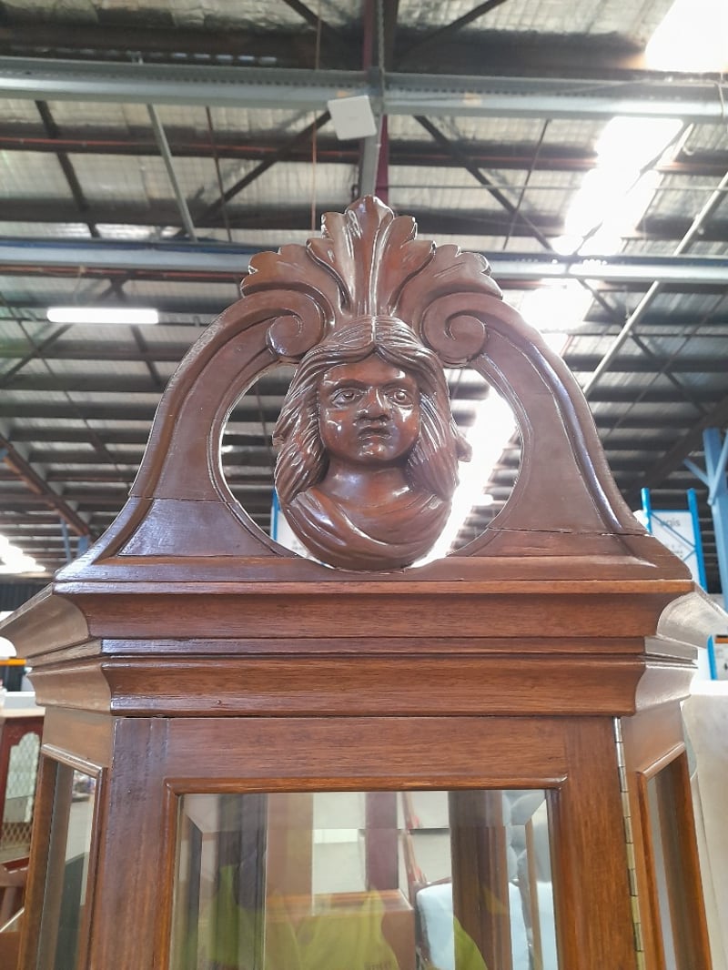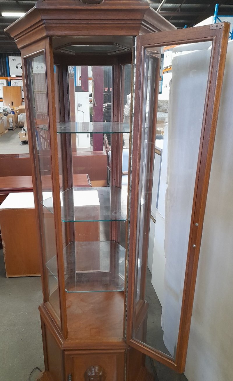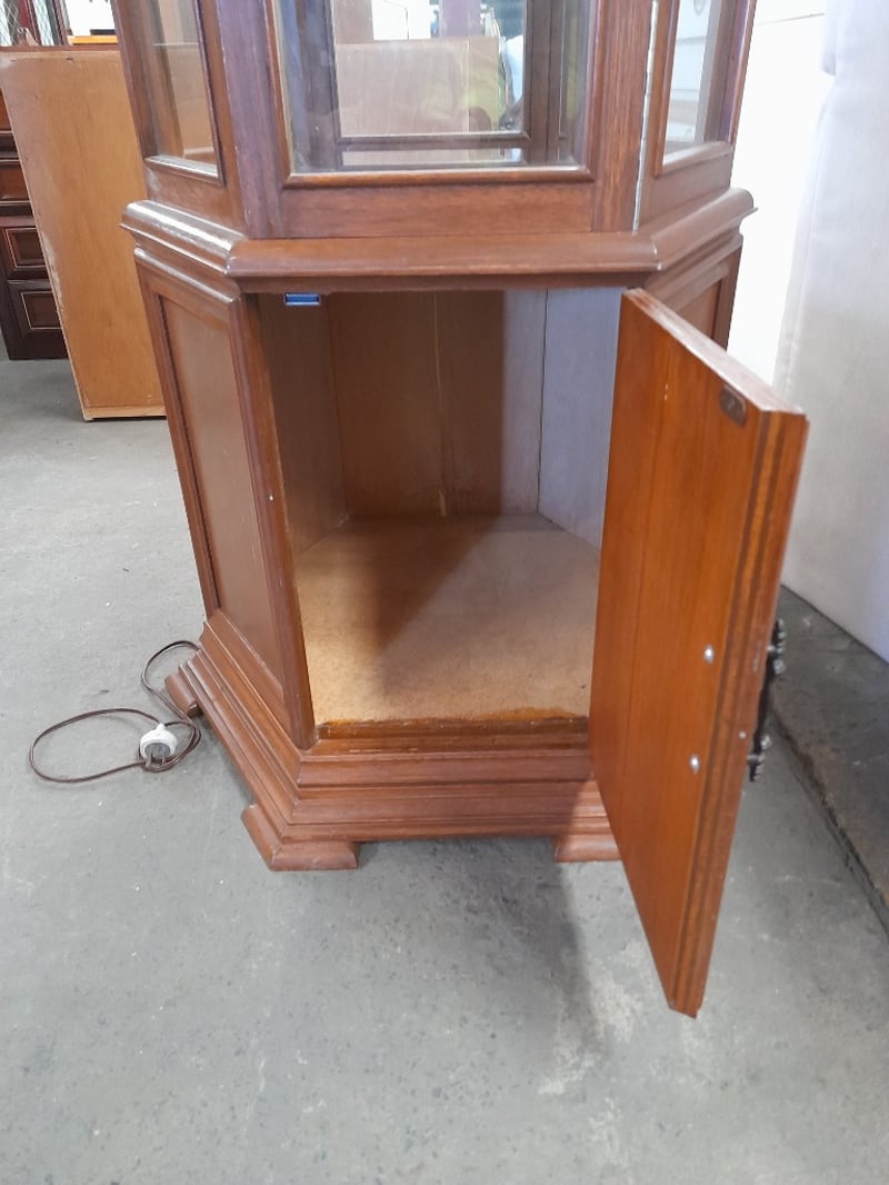 Cabinet, wooden hexagonal display, carved woman figure, glass sides, fitred hexagon shelves, internal lightsDims: 212 × 70 × 70cmNote: Light is untested