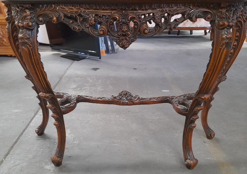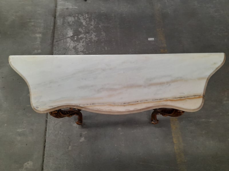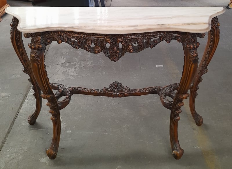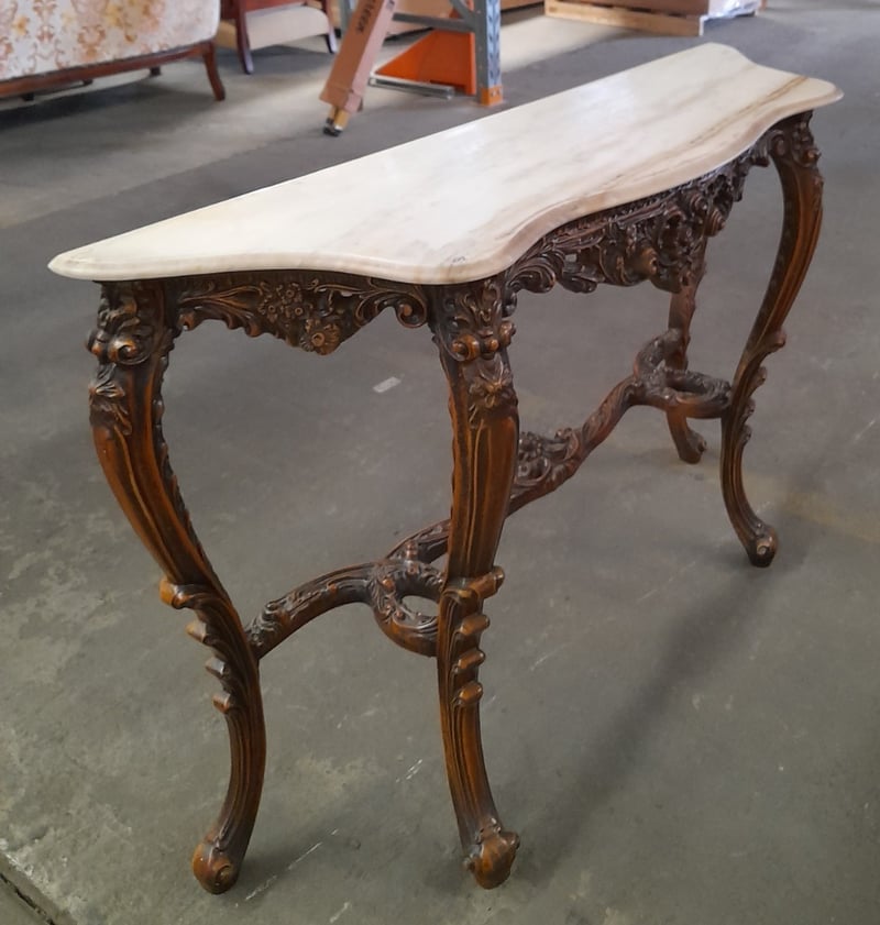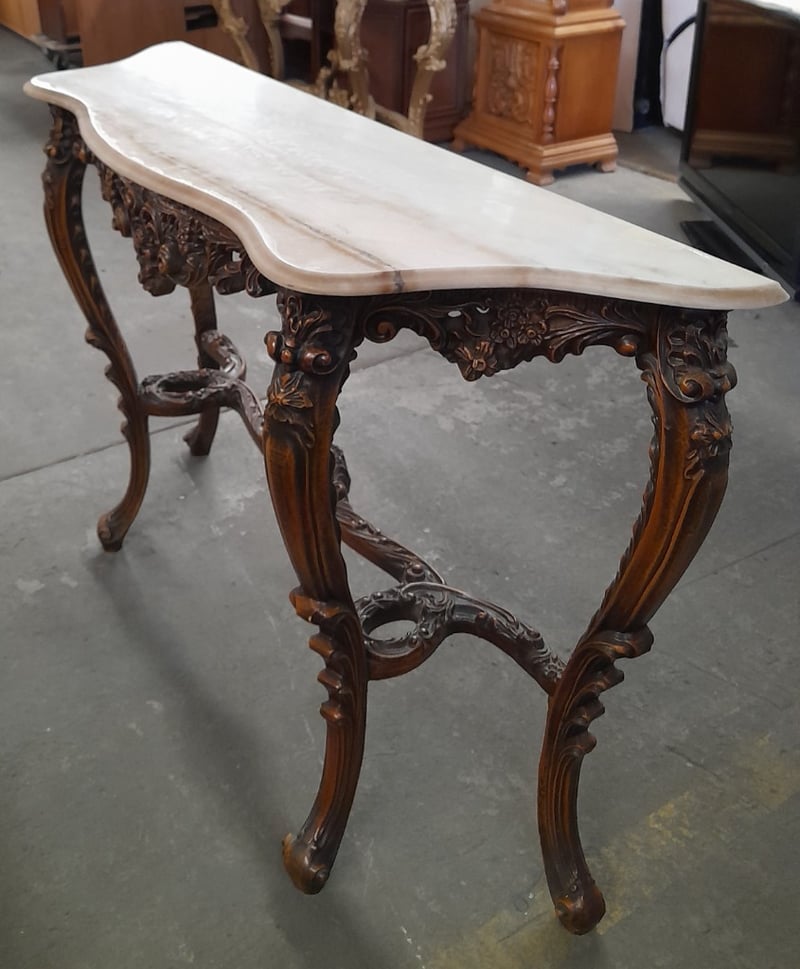 Console table, ornate dark carved wood with white marble topDims: 78 × 118 × 34cmNote: Marble shows signs of abrasions
