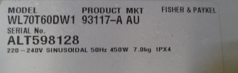 Washing Machine, Fisher & Paykel 7kg top loader, S/N: ALT598128Dims: 102 × 59 × 63cmNote: Unit is untested