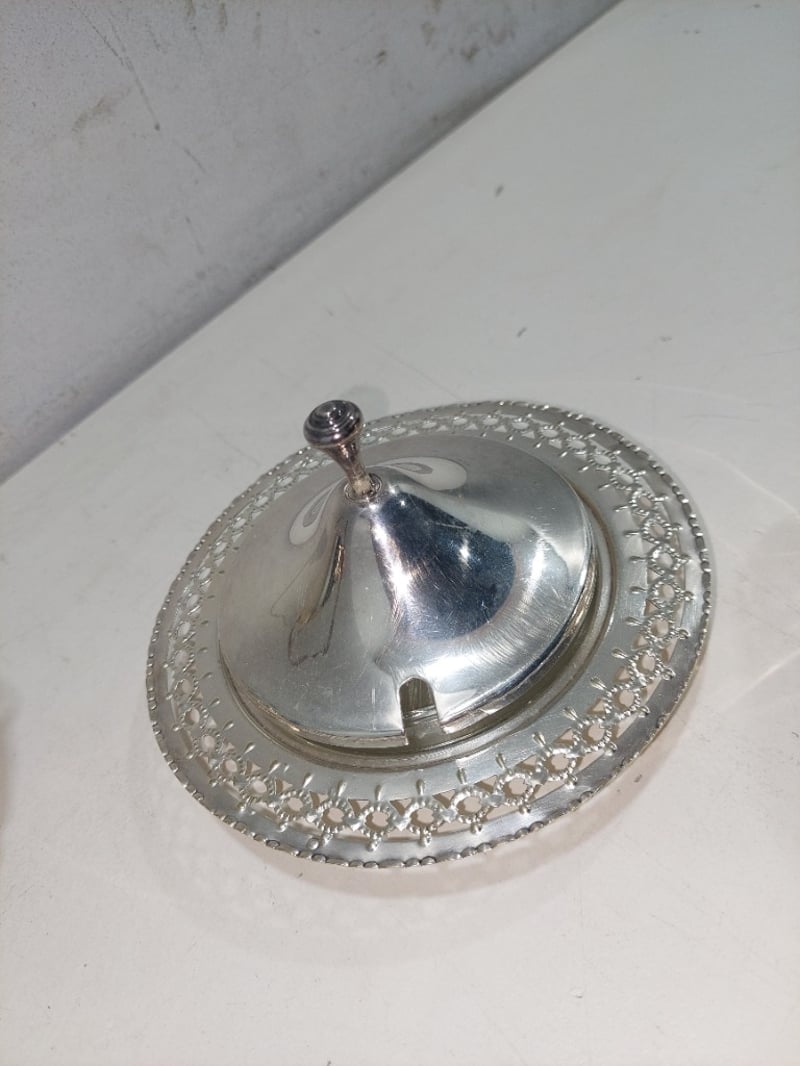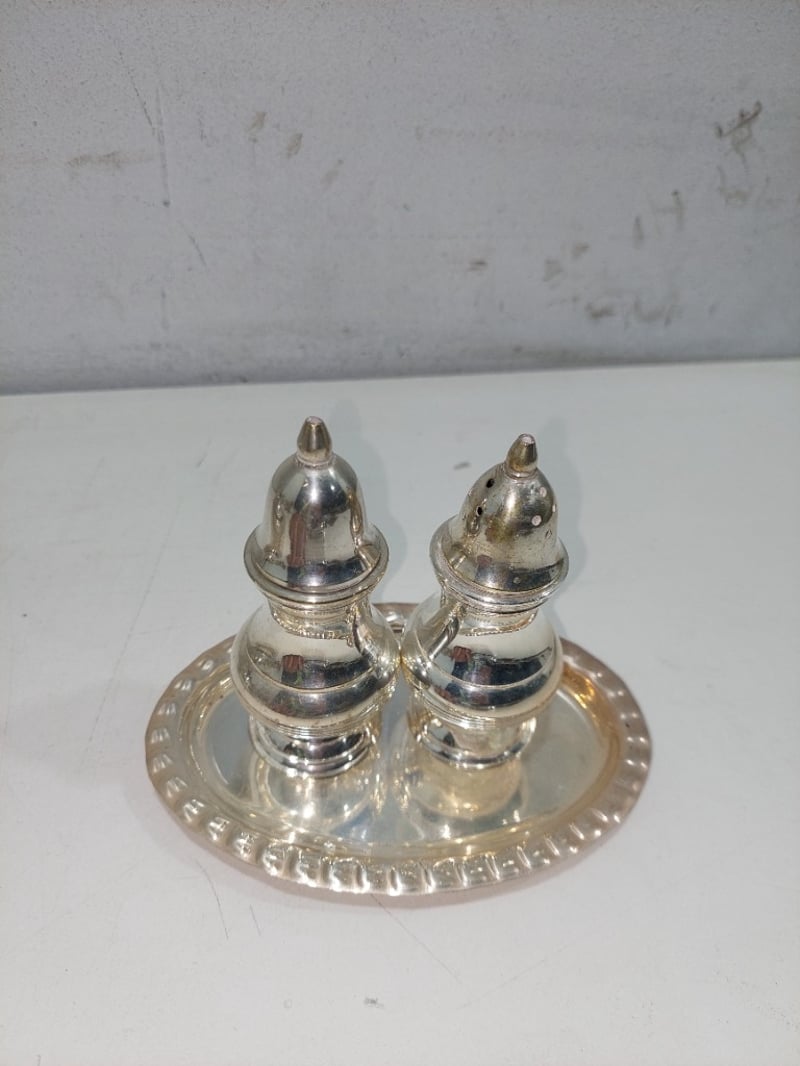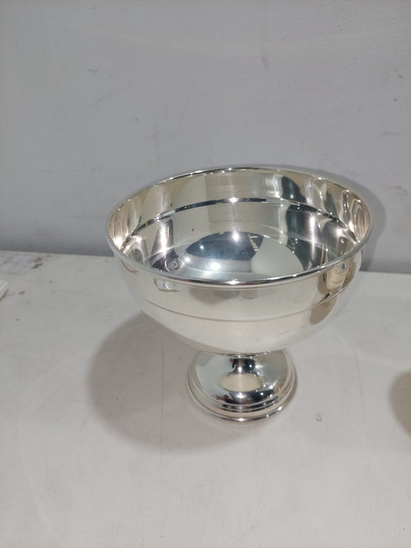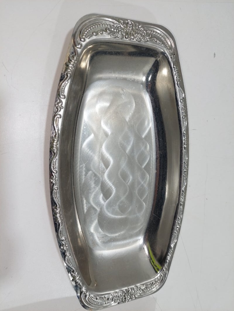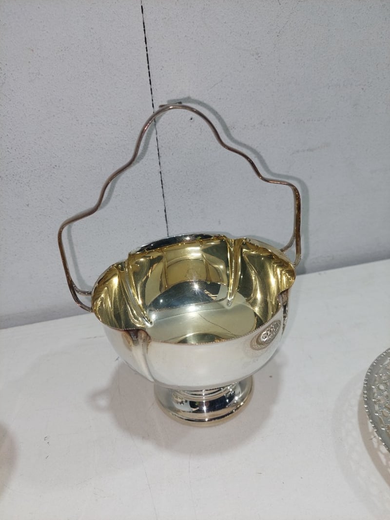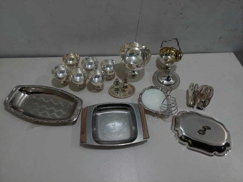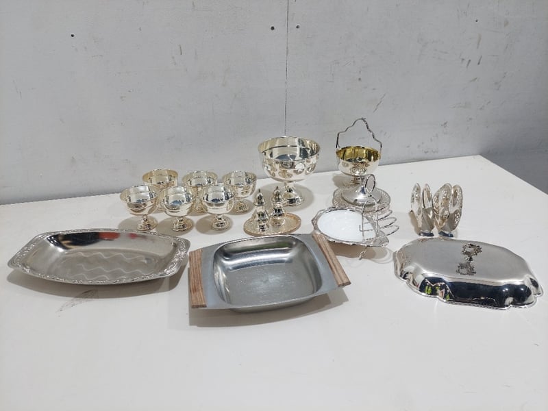 A collection of silverware, includes a variety of serving dishes, trays, and other tableware. Sold as a lot.