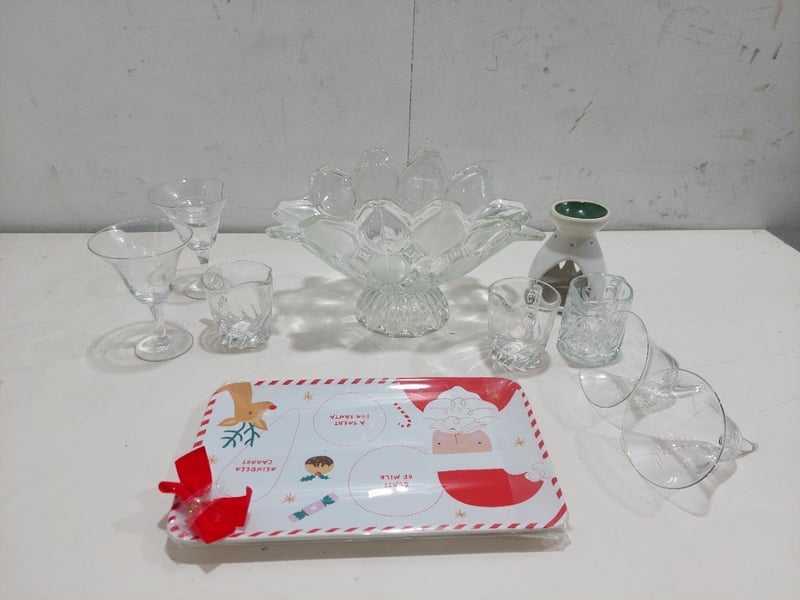 Assorted glassware, including serving trays, glasses and cups.Sold as a lot.Note: some glasses are broken.