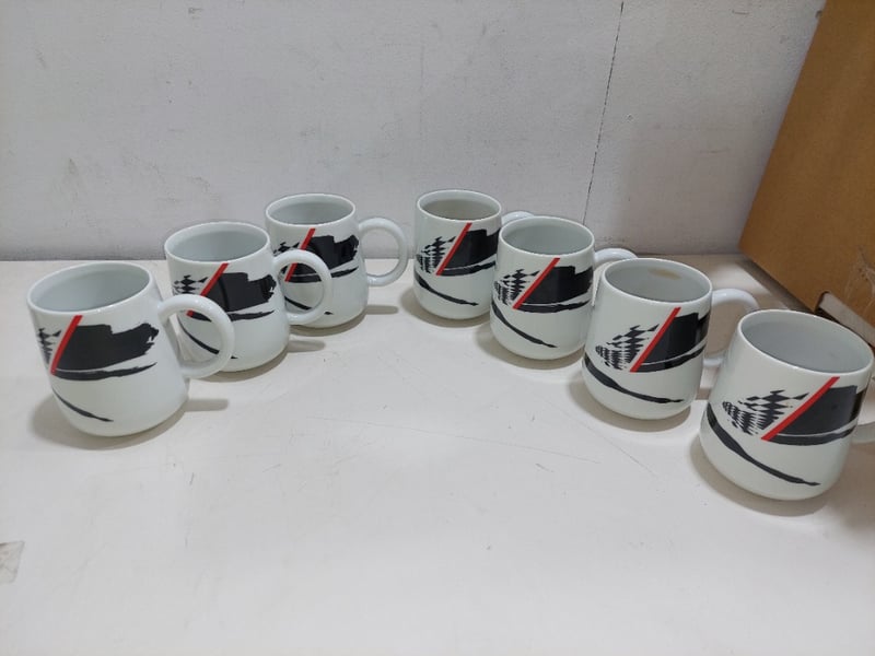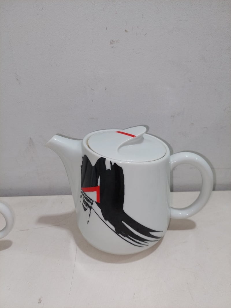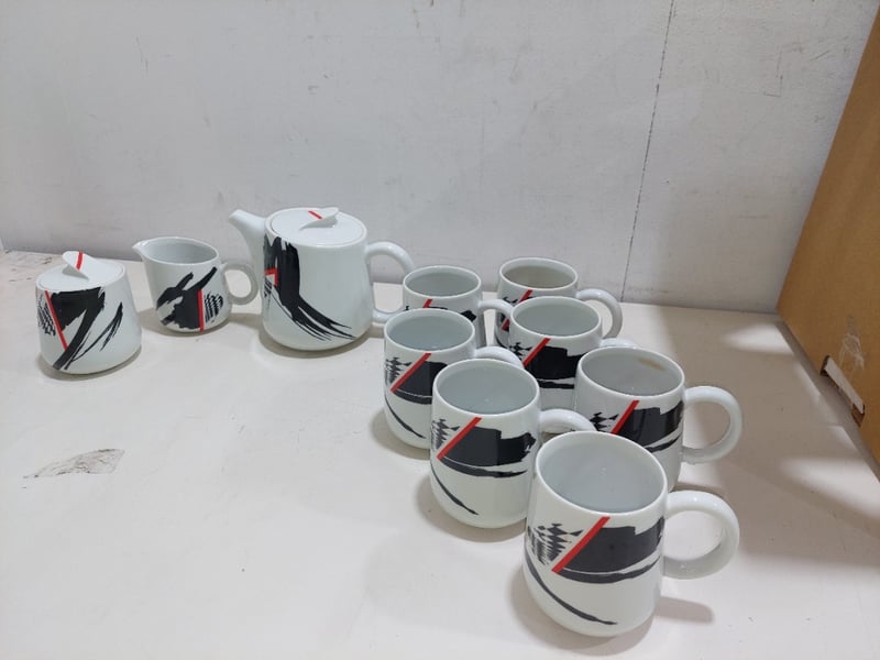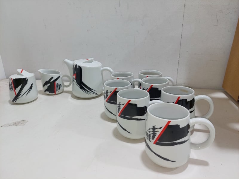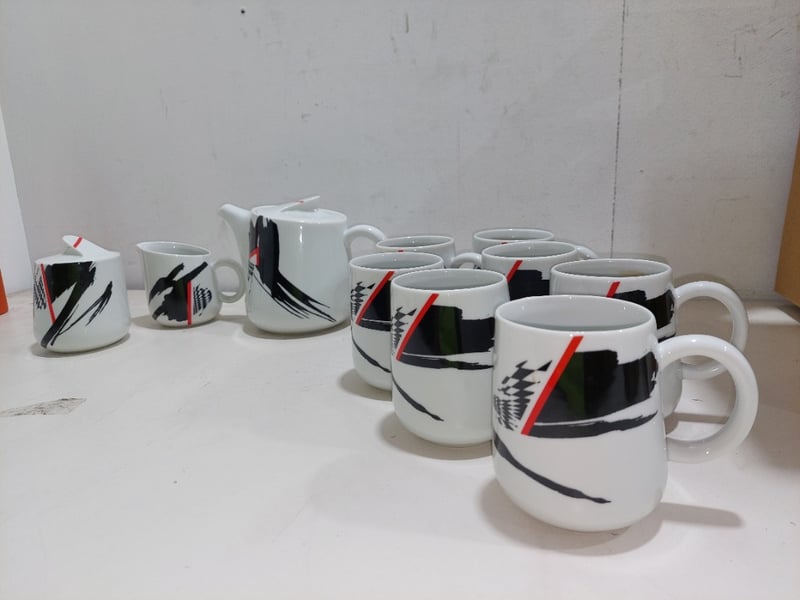 Vintage like, Fujimori Kato Kogei Japanese Contemporary tea set, includes, teapot, sugar bowl, creamer, seven mugs.Sold as a lot.