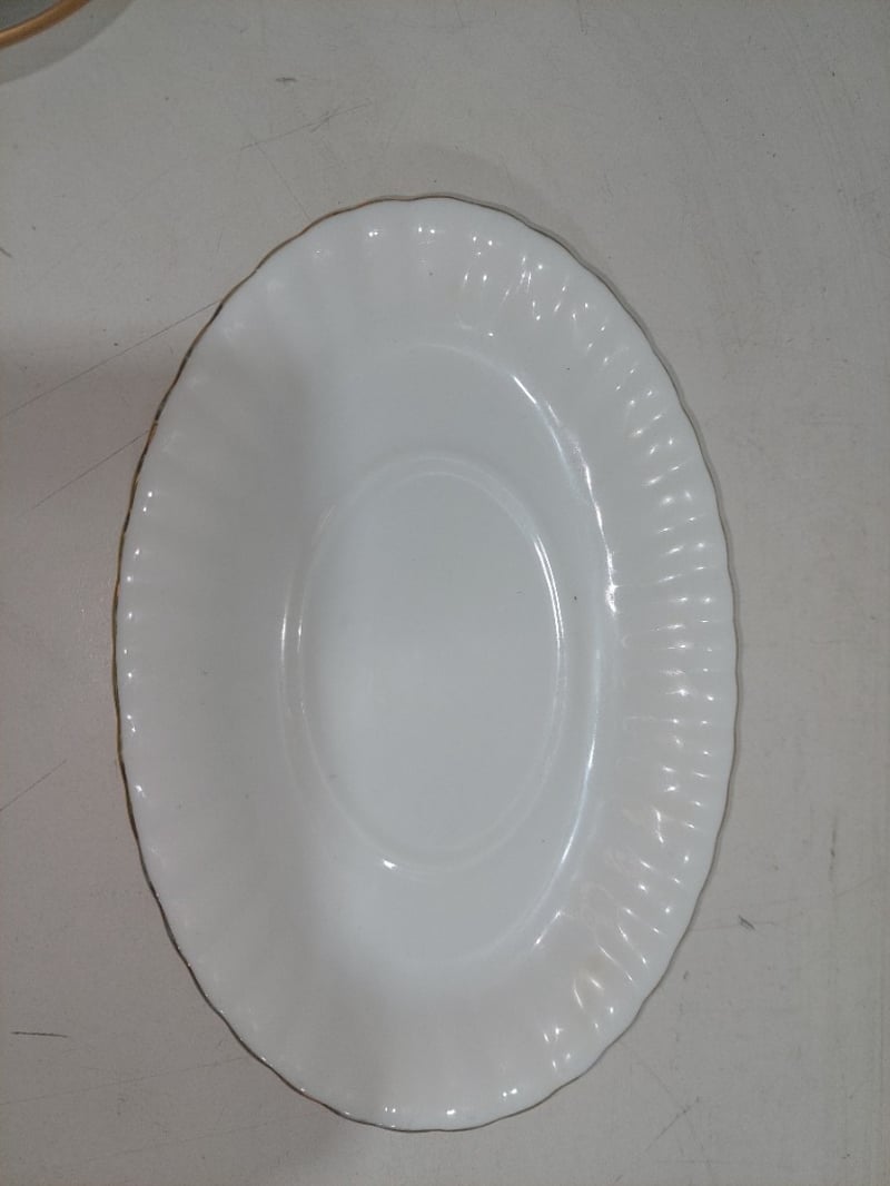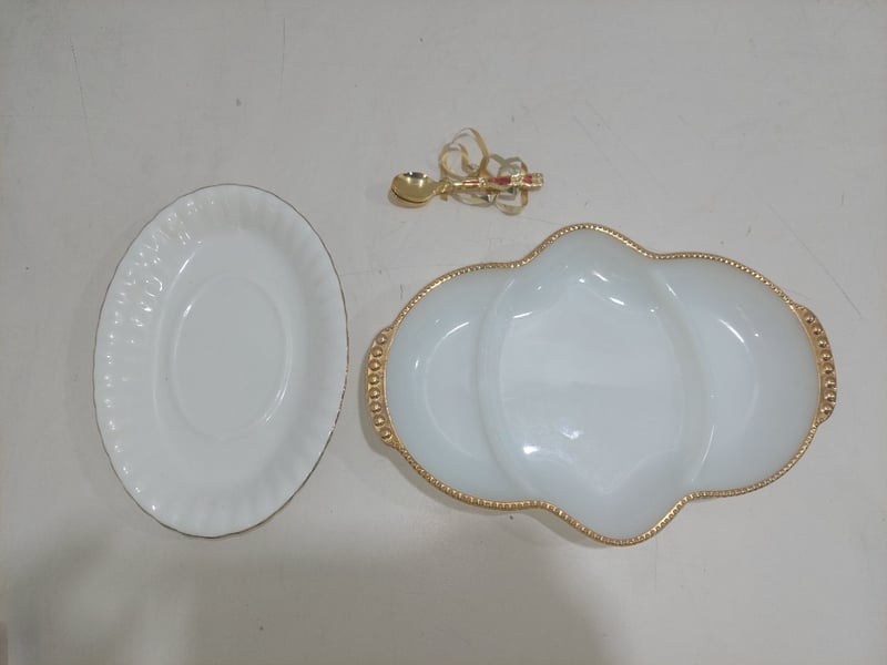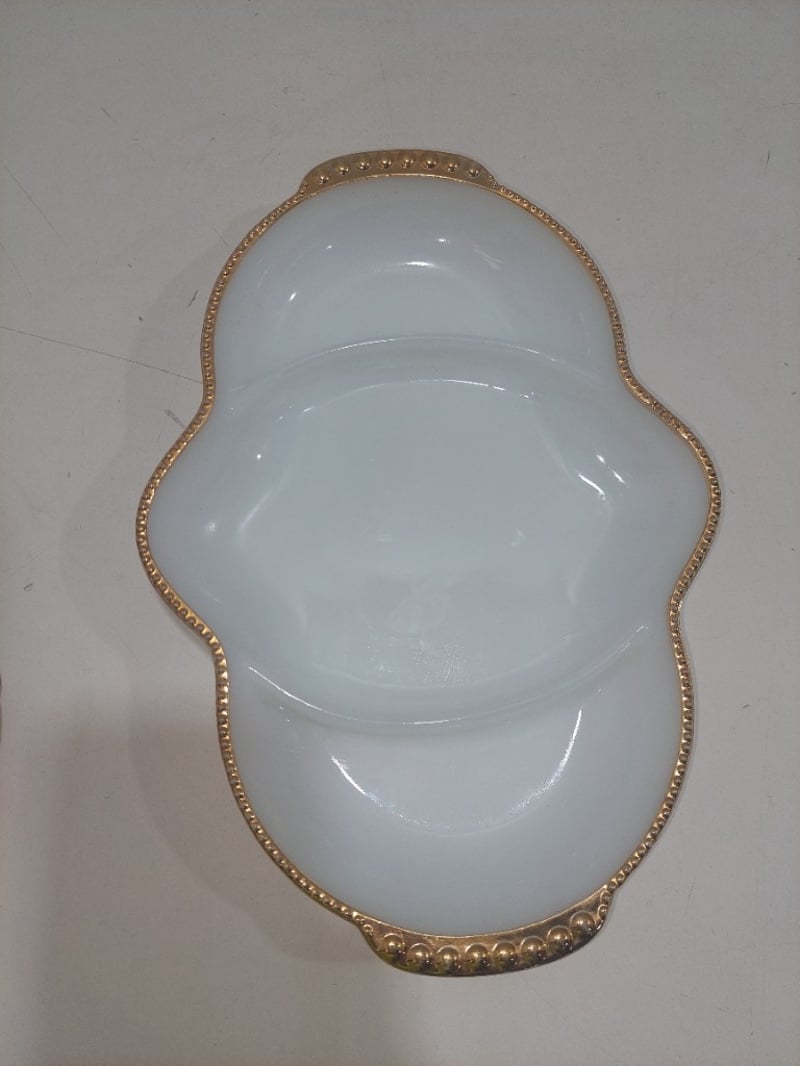 A vintage Fire-King Oven Ware milk glass divided relish dish with gold trim along with spoons and oval saucer.Sold as a lot.