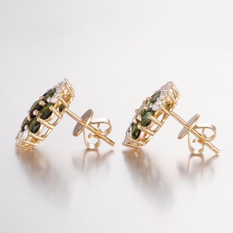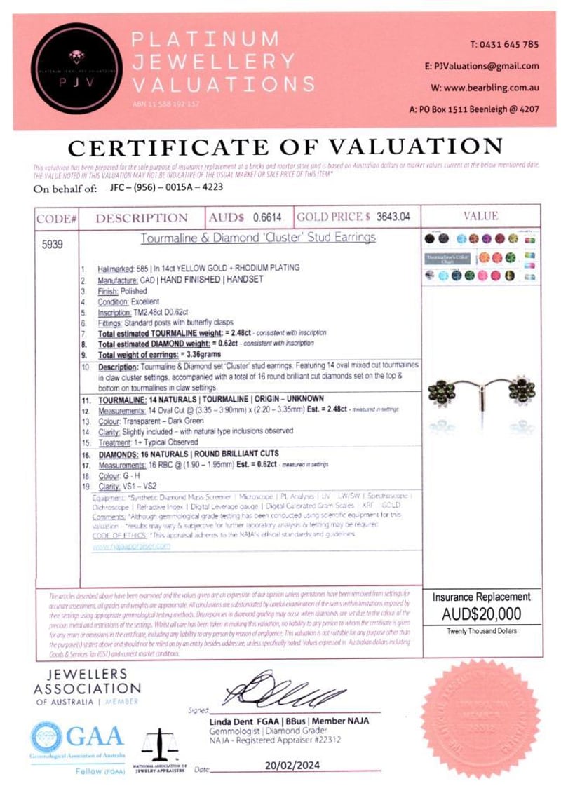 14CT YELLOW GOLD TOURMALINE AND DIAMOND FLORAL STUD EARRINGS FEATURING CENTRE, 14 OVAL CUT, DARK GREEN TOURMALINES (2.48CT TSW, SLIGHTLY INCLUDED), BEAD SET, WITH 16 ROUND BRILLIANT CUT DIAMONDS (0.62CT TDW, G-H COLOUR, VS1-VS2 CLARITY), BEAD SET.