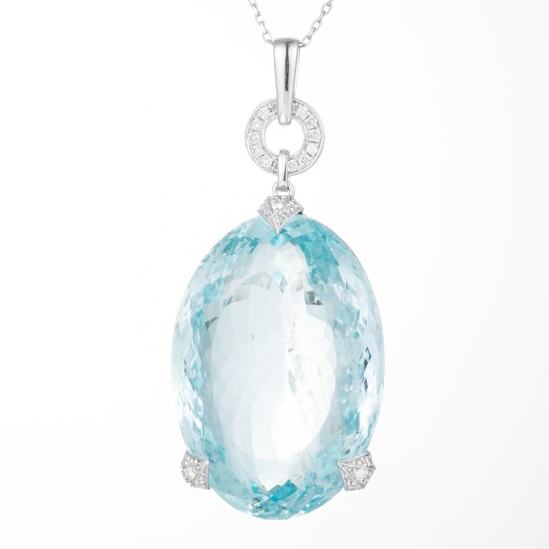 14CT WHITE GOLD AQUAMARINE AND DIAMOND NECKLACE FEATURING, ONE OVAL CUT, LIGHT PALE GREEN-BLUE AQUAMARINE (51.53CT, MODERATELY INCLUDED), CLAW SET, WITH 26 ROUND BRILLIANT CUT DIAMONDS (0.23CT TDW, G-H COLOUR, SI1-SI2 CLARITY), BEAD SET. CHAIN LENGTH IS ADJUSTABLE BETWEEN 45 AND 50CM.