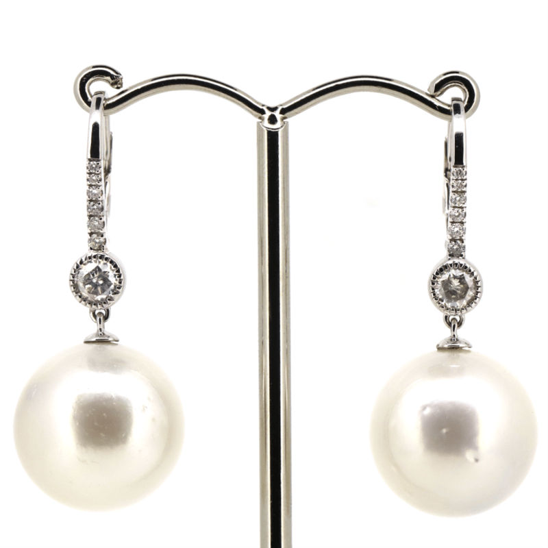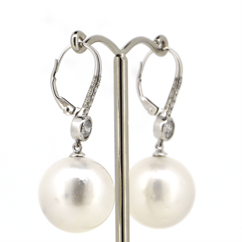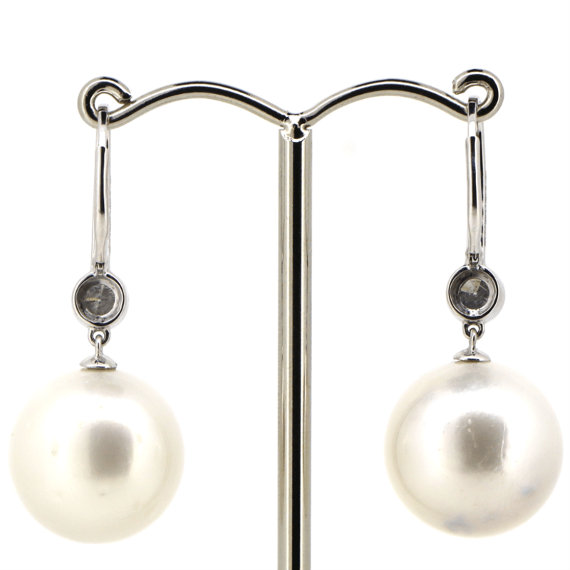 14K WHITE GOLD, WHITE CULTURED SOUTH SEA PEARL AND DIAMOND, DROP EARRINGS. THE DESIGN FEATURES, 2 NEAR ROUND, WHITE WITH OVERTONES OF SILVER, CULTURED SOUTH SEA PEARLS (57.06CT TSW, LIGHT-MEDIUM BLEMISHED). SURMOUNTED BY 2 ROUND BRILLIANT CUT, DIAMONDS (0.53CT TDW, H-J COLOUR, I2+ CLARITY), BEZEL SET. DECORATING THE HOOKS ARE, 12 ROUND BRILLIANT CUT, DIAMONDS (0.12CT TDW, H-I COLOUR, SI-I1 CLARITY, 1.00-1.50MM), CLAW SET. EARRINGS HAVE HOOKS WITH LATCH BACKS. Valuations Provided by an Independent Third-Party Professional Not Directly Associated With Lloyds Auctions at AUD $14900This valuation has been conducted by an independent third-party professional. The valuation amount is an assessment by the issuing valuer and does not reflect the auction value of the item. Any inquiries regarding the valuation should be directed to the issuing valuer (refer to contact details on the certificate), as Lloyds Auctions has no affiliation or influence over the valuation, the valuer, or the stated amount. Condition: Good - Refer Images 0645866+23