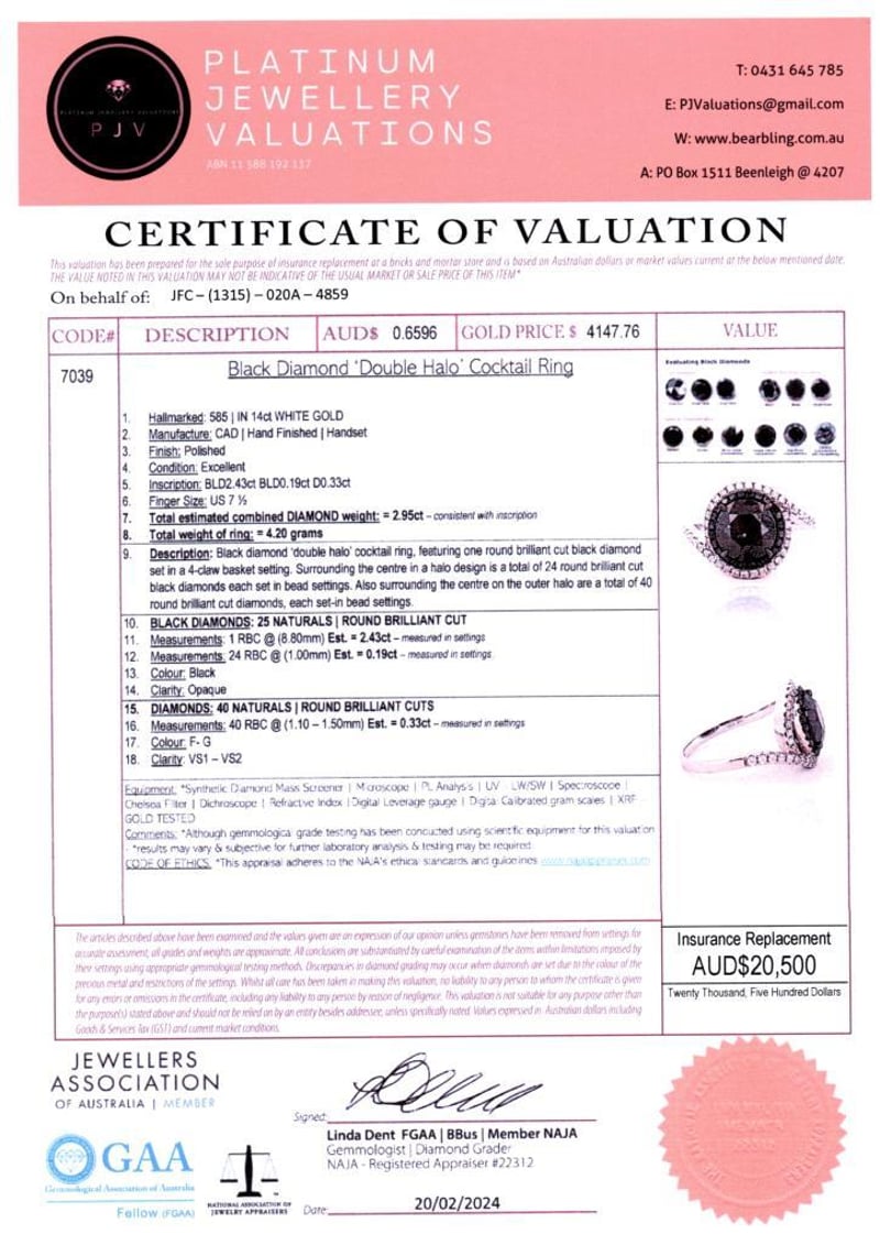14CT WHITE GOLD BLACK DIAMOND COCKTAIL RING FEATURING CENTRE, ONE ROUND BRILLIANT CUT, BLACK DIAMOND (2.43CT, OPAQUE, ENHANCED), WITH 24 ROUND BRILLIANT CUT, BLACK DIAMONDS (0.19CT TDW, OPAQUE, ENHANCED), BEAD SET, WITH 40 ROUND BRILLIANT CUT DIAMONDS (0.33CT TDW, F-G COLOUR, VS1-VS2 CLARITY), BEAD SET. RING SIZE O. Valuations Provided by an Independent Third-Party Professional Not Directly Associated With Lloyds Auctions at AUD $20500This valuation has been conducted by an independent third-party professional. The valuation amount is an assessment by the issuing valuer and does not reflect the auction value of the item. Any inquiries regarding the valuation should be directed to the issuing valuer (refer to contact details on the certificate), as Lloyds Auctions has no affiliation or influence over the valuation, the valuer, or the stated amount. Condition: Good - Refer Images 0586211+1348