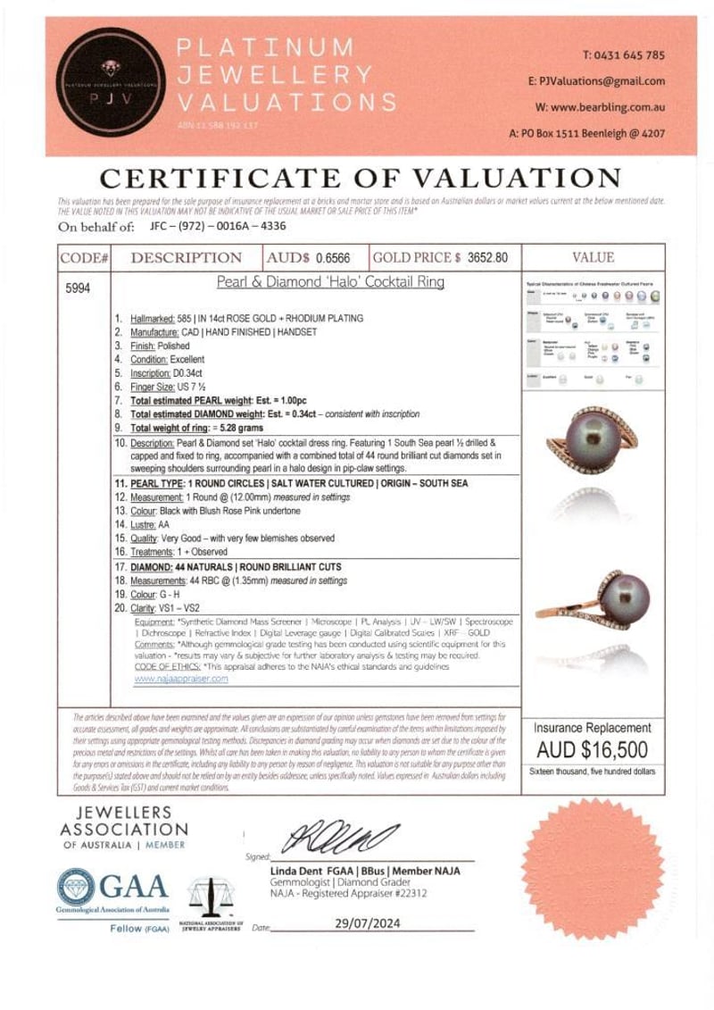 14CT ROSE GOLD PEARL AND DIAMOND COCKTAIL RING FEATURING CENTRE, ONE ROUND, BLACK/BLUSH ROSE PINK CULTURED SOUTH SEA PEARL (12.00M SIZE, AA GRADE), WITH 44 ROUND BRILLIANT CUT DIAMONDS (0.34CT TDW, G-H COLOUR, VS1-VS2 CLARITY), PIP CLAW SET. RING SIZE O. Valuations Provided by an Independent Third-Party Professional Not Directly Associated With Lloyds Auctions at AUD $16500This valuation has been conducted by an independent third-party professional. The valuation amount is an assessment by the issuing valuer and does not reflect the auction value of the item. Any inquiries regarding the valuation should be directed to the issuing valuer (refer to contact details on the certificate), as Lloyds Auctions has no affiliation or influence over the valuation, the valuer, or the stated amount. Condition: Good - Refer Images 0586211+1364