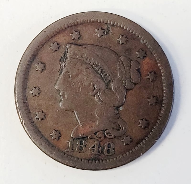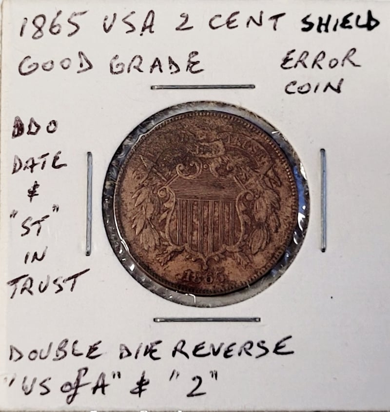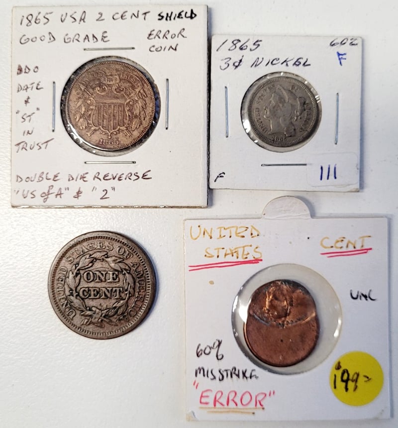 COLLECTION OF USA COINS INCLUDING ERRORSIncludes- - Lincoln Unc 60% Mis-Strike Error One Cent - 1848 Large Cent Braided Hair Type ( Superior Grade For Type And Age)- 1865 3C Nickel ( No Mm ) - 1865 2C Shield Ddr On " Us Of A" And "2"488274+61