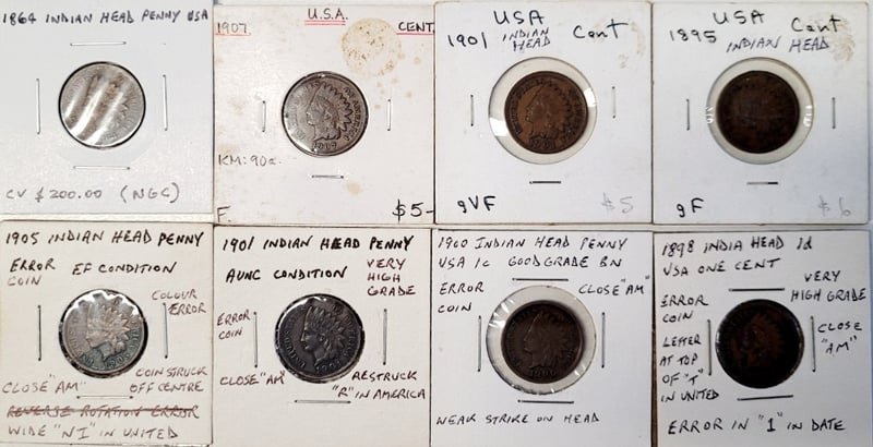 COLLECTION OF INDIAN HEAD PENNIES, USA , HIGH GRADE AND ERROR COINSProvenance: Includes - - 1864 Cv Us $200.00 ( Source : Ngc ) - 1895 - Good Fine - 1898 - High Grade , Close " Am" , Letter At Top Of " T" In United, Error "I" In Date, Spiral Patterns Between " C " And " E " And Above " O " X 2 - 1900 - Good Grade " Brown " , Close " Am " , Weak Strike On Head , Weak Strike On Wreath And Double Strike On " One Cent" - 1901 - Good Very Fine - 1901 - Aunc , Close " Am " , Restrucj " R" In America, 2Nd Strike On Reverse " Cent " - 1905 - Ef, Colour Error , Close " Am " , Struck Off Centre, Wide " Ni " In United Double - Struck On " R" 1907 - Ef+488274+62