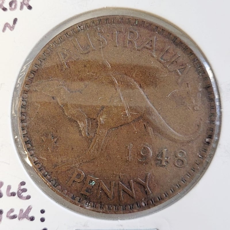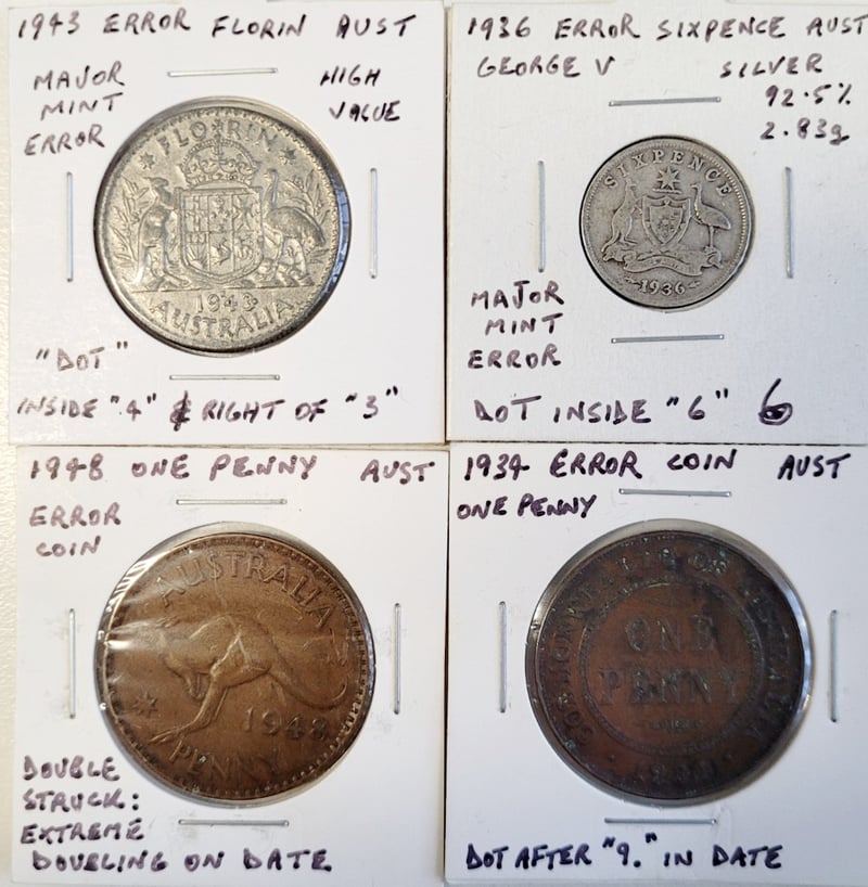 AUSTRALIAN " ERROR " COIN COLLECTIONProvenance: Includes- - 1936 Six Pence Dot Inside "6"- 1945 Florin Dot Inside " 4" And Right Of "3" In Date - 1948 One Penny With Extreme Doubling On Date - 1934 One Penny Dot After "9" In Date488274+76
