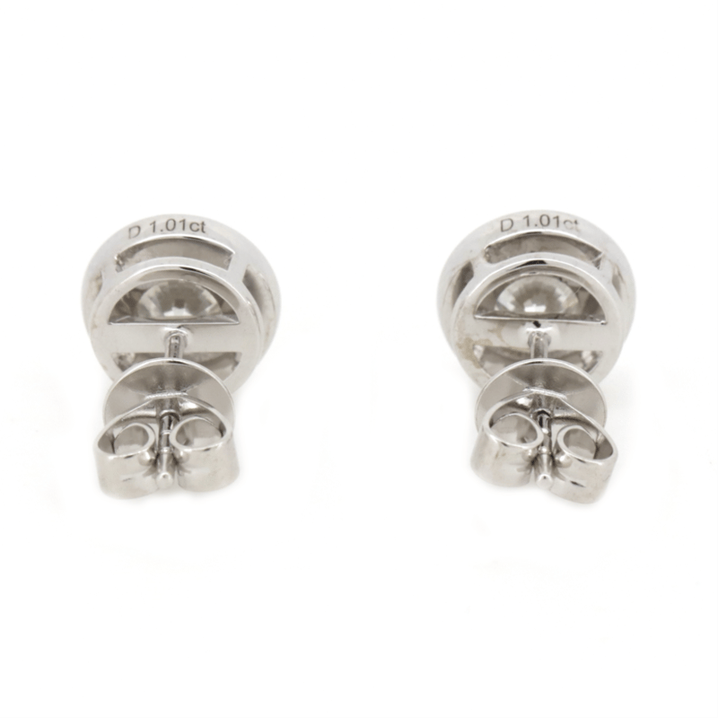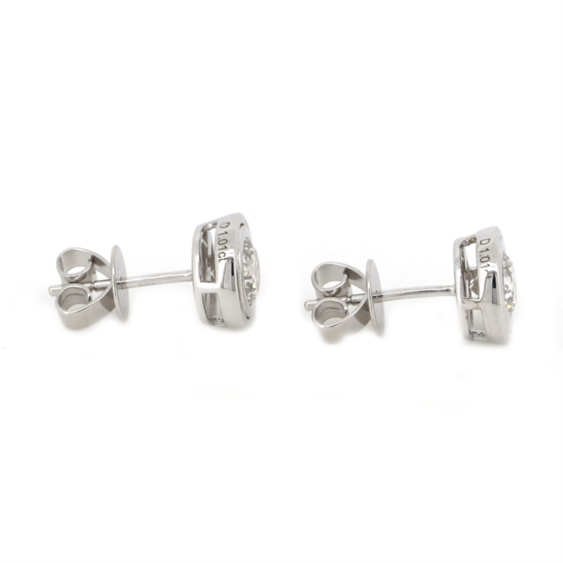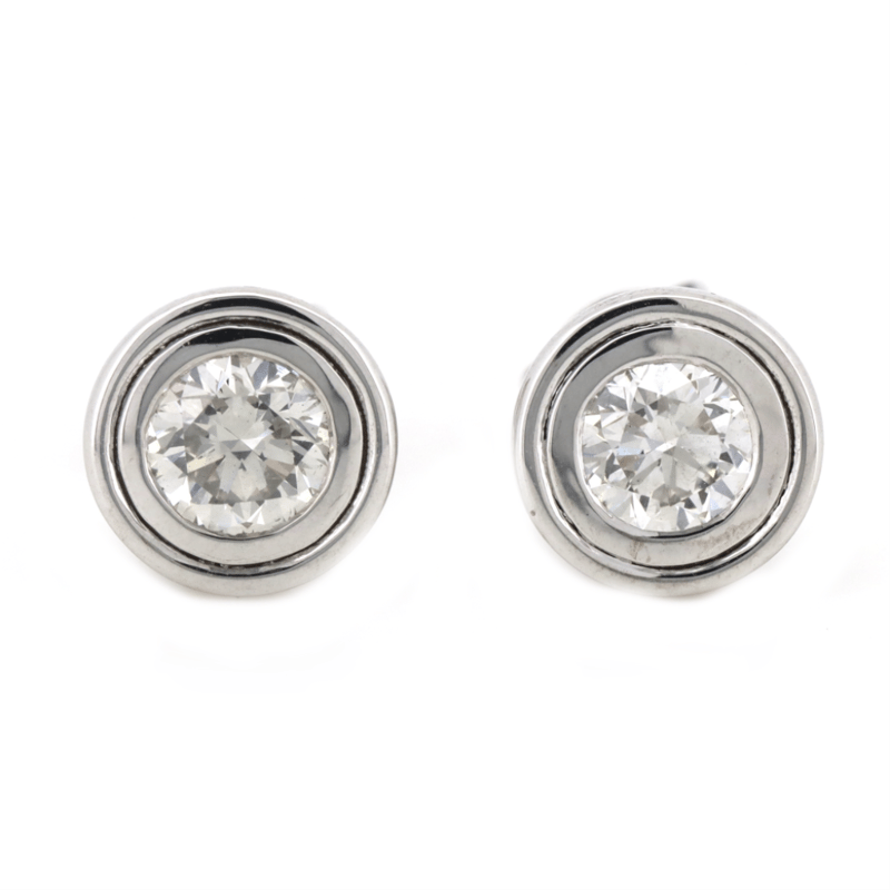14K WHITE GOLD, 1.01CT TDW DIAMOND, SOLITAIRE STUD EARRINGS. THE CENTRES FEATURE, 2 ROUND BRILLIANT CUT, DIAMONDS (1.01CT TDW, G-H COLOUR, SI1-SI2 CLARITY), BEZEL SET. EARRINGS HAVE POST BACKS AND COME WITH, 14K WHITE GOLD BACKS.