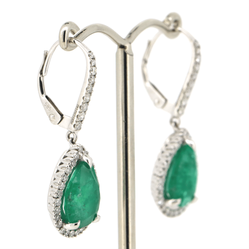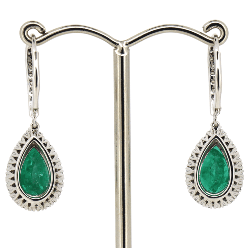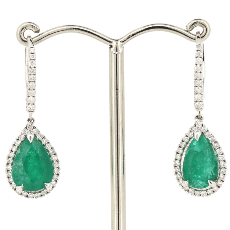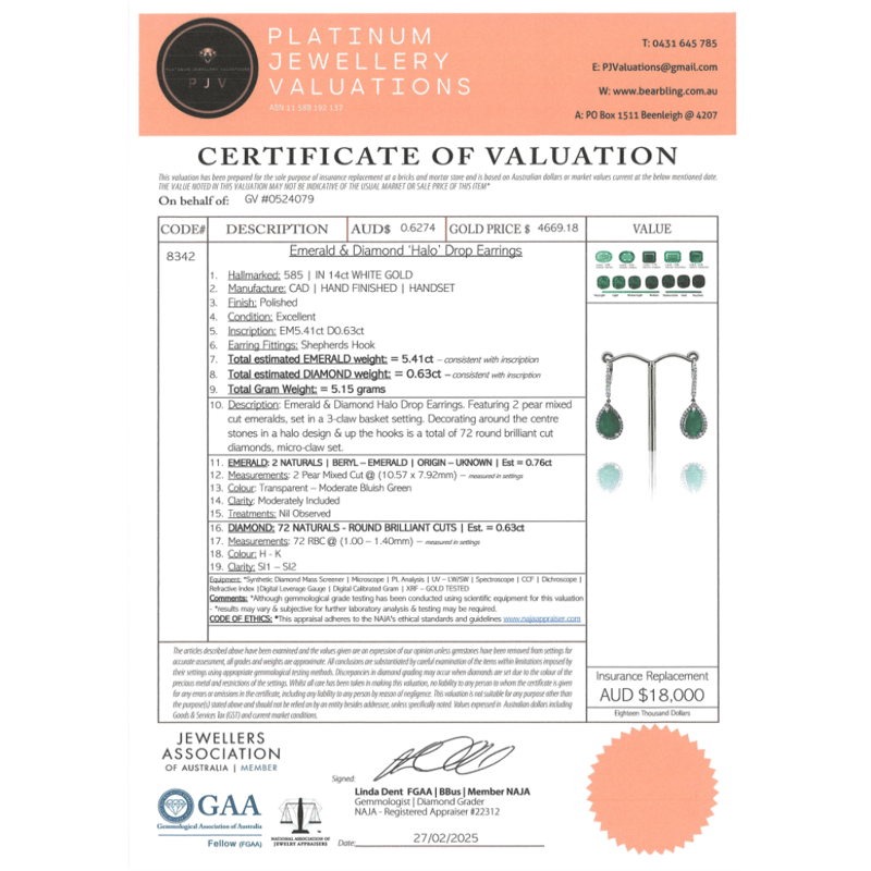 14K WHITE GOLD, EMERALD AND DIAMOND, HALO DROP EARRINGS. THE CENTRES FEATURE, 2 PEAR CUT, BLUISH-GREEN, EMERALDS (5.41CT TSW, INCLUDED), INDIVIDUAL 3 CLAW SET. SURROUNDING THE CENTRES ARE, 72 ROUND BRILLIANT CUT, DIAMONDS (0.63CT TDW, H-K COLOUR, SI1-I2 CLARITY), MICRO-CLAW SET. THE EARRINGS FEATURE LEVER BACK CLOSURES. Valuations Provided by an Independent Third-Party Professional Not Directly Associated With Lloyds Auctions at AUD $18,000.00This valuation has been conducted by an independent third-party professional. The valuation amount is an assessment by the issuing valuer and does not reflect the auction value of the item. Any inquiries regarding the valuation should be directed to the issuing valuer (refer to contact details on the certificate), as Lloyds Auctions has no affiliation or influence over the valuation, the valuer, or the stated amount. Condition: Good - Refer Images 0645880+253