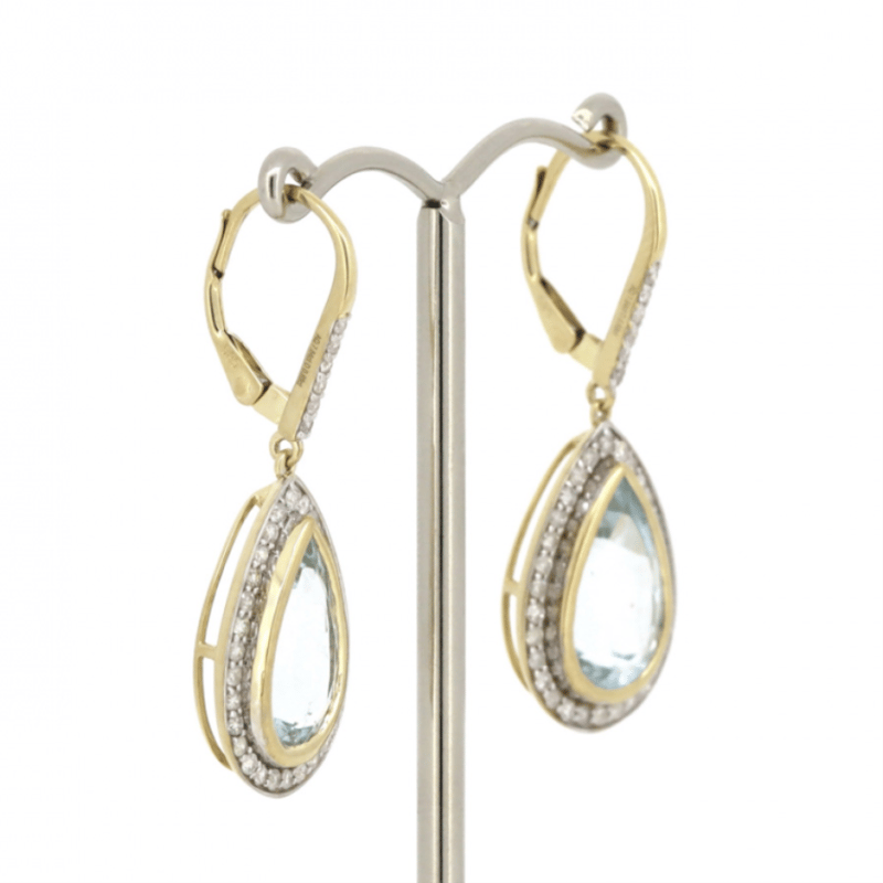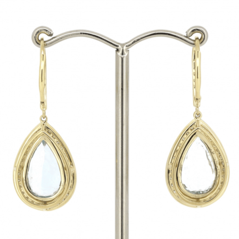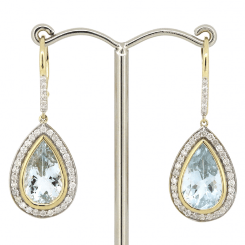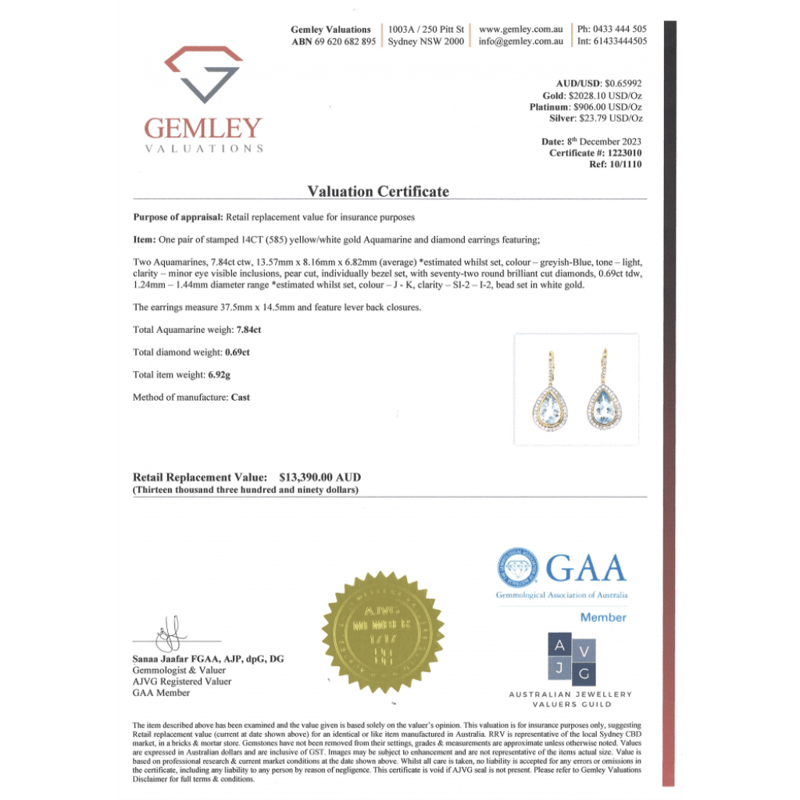 14K YELLOW GOLD, AQUAMARINE AND DIAMOND, HALO DROP EARRINGS. THE CENTRES FEATURE, 2 PEAR CUT, LIGHT GREYISH-BLUE, AQUAMARINES (7.84CT TSW, MINOR EYE VISIBLE INCLUSIONS), BEZEL SET. SURROUNDING THE STONES IN INDIVIDUAL HALOS AND DECORATING THE HOOKS ARE, 72 ROUND BRILLIANT CUT, DIAMONDS (0.69CT TDW, J-K COLOUR, SI2-I2 CLARITY), BEAD SET IN WHITE GOLD. THE EARRINGS FEATURE LEVER BACK CLOSURES. Valuations Provided by an Independent Third-Party Professional Not Directly Associated With Lloyds Auctions at AUD $13,390.00This valuation has been conducted by an independent third-party professional. The valuation amount is an assessment by the issuing valuer and does not reflect the auction value of the item. Any inquiries regarding the valuation should be directed to the issuing valuer (refer to contact details on the certificate), as Lloyds Auctions has no affiliation or influence over the valuation, the valuer, or the stated amount. Condition: Good - Refer Images 0645880+240