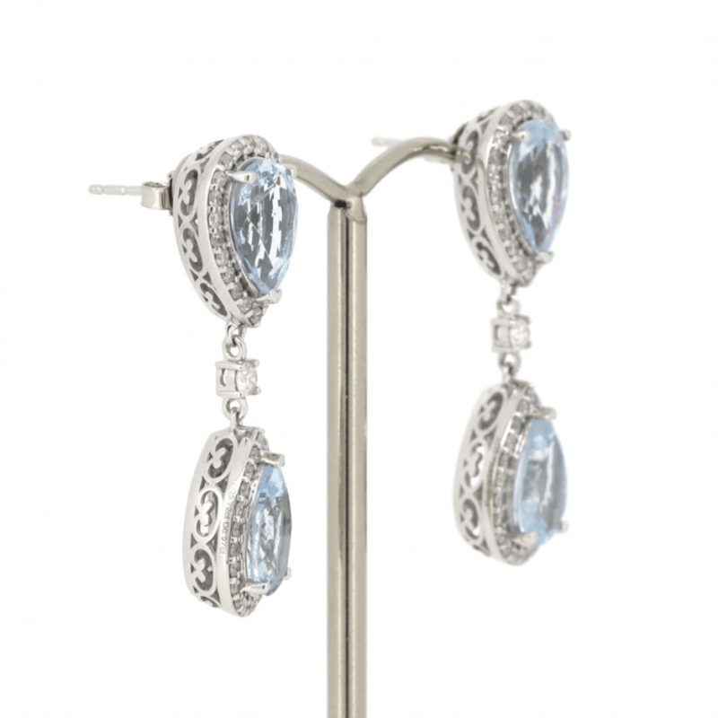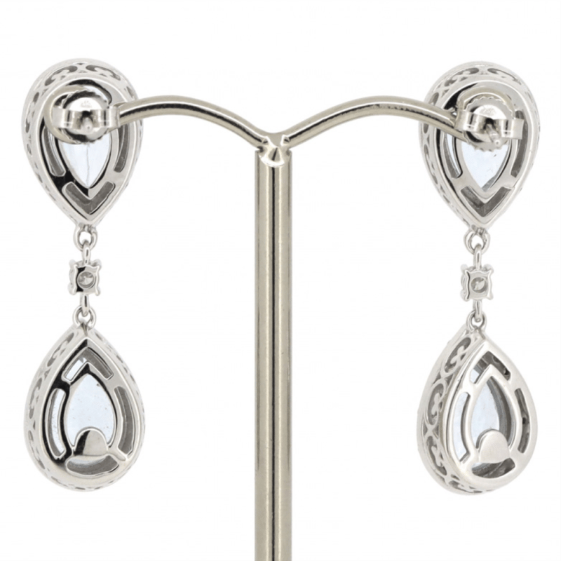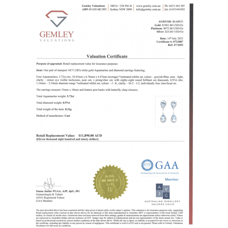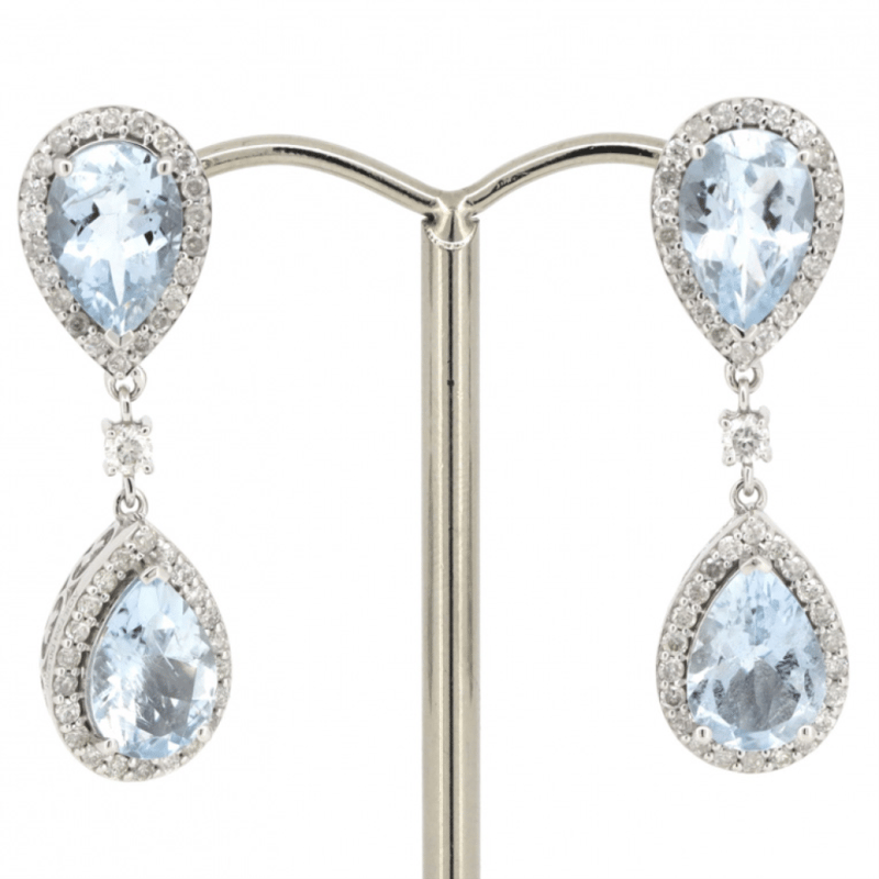 14K WHITE GOLD, AQUAMARINE AND DIAMOND, HALO DROP EARRINGS. THE DESIGN FEATURES, 4 PEAR CUT, LIGHT GREYISH-BLUE, AQUAMARINES (5.72CT TSW, MINOR EYE VISIBLE INCLUSIONS), V PRONG/CLAW SET. SURROUNDING THE STONES IN HALOS AND DECORATING THE JOINS ARE, 88 ROUND BRILLIANT CUT, DIAMONDS (0.97CT TDW, J-K COLOUR, SI2-I2 CLARITY), CLAW/BEAD SET. THE EARRINGS HAVE POST BACKS, WITH, 14K WHITE GOLD BUTTERFLY CLASPS. Valuations Provided by an Independent Third-Party Professional Not Directly Associated With Lloyds Auctions at AUD $11,890.00This valuation has been conducted by an independent third-party professional. The valuation amount is an assessment by the issuing valuer and does not reflect the auction value of the item. Any inquiries regarding the valuation should be directed to the issuing valuer (refer to contact details on the certificate), as Lloyds Auctions has no affiliation or influence over the valuation, the valuer, or the stated amount. Condition: Good - Refer Images 0645880+268